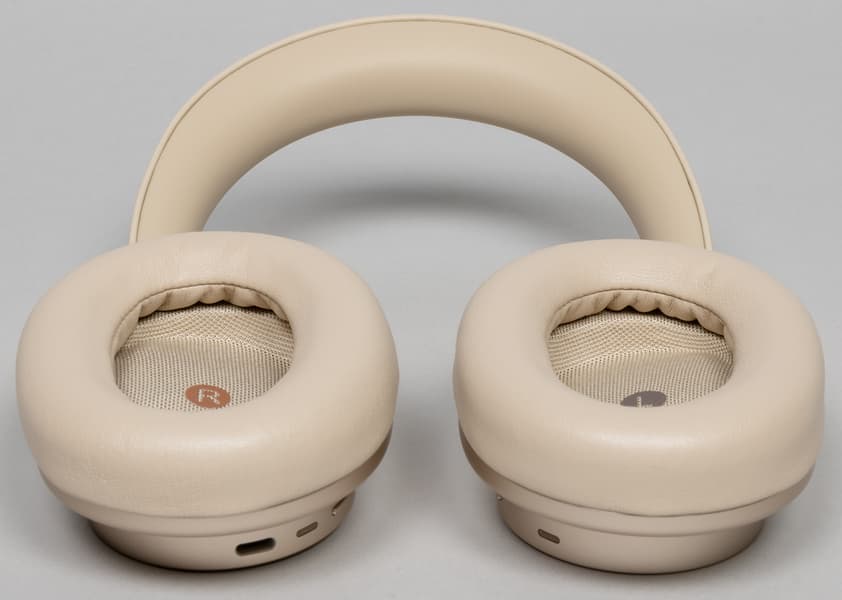 В нижних торцах обеих чашек видны прикрытые металлической сеткой отверстия микрофонов для голосовой связи. На правом также находится порт USB Type C для зарядки.