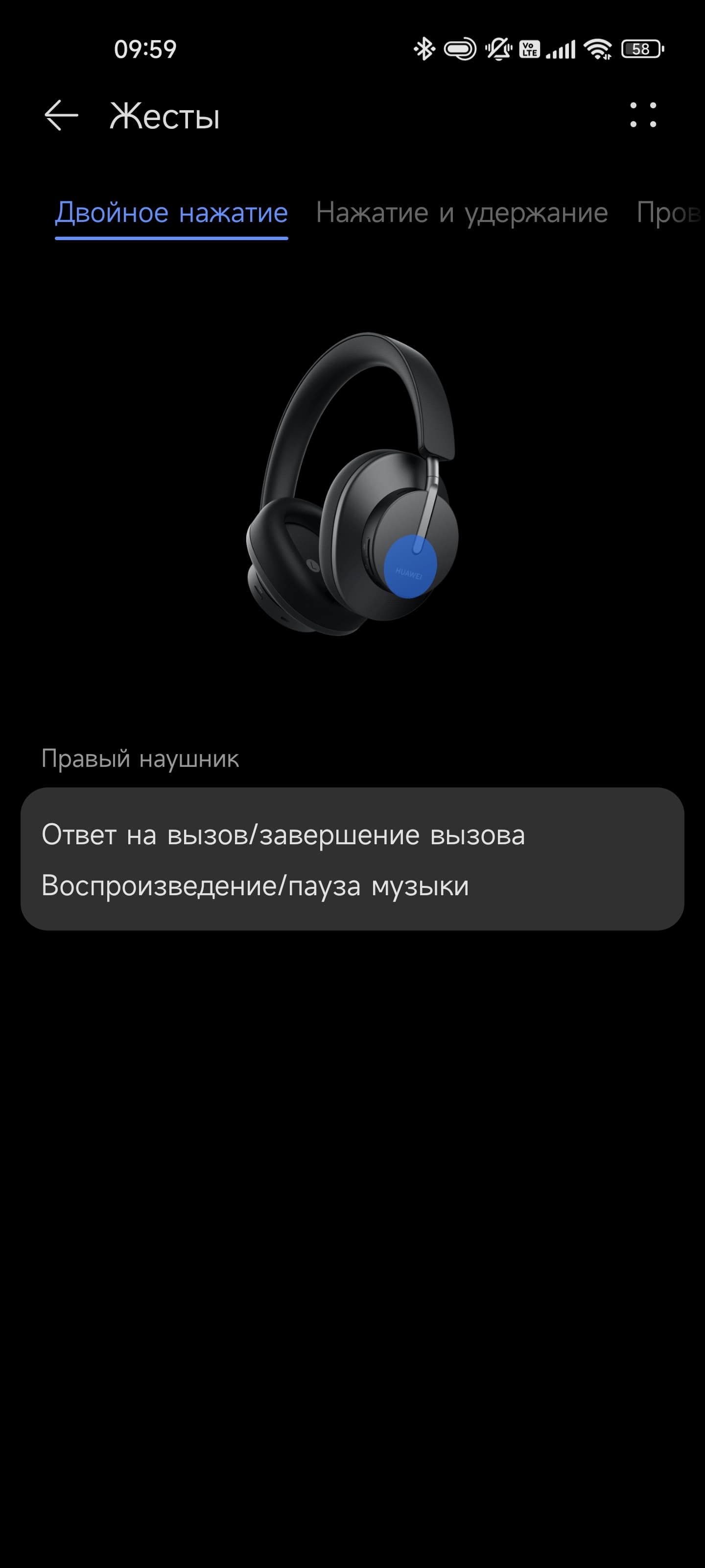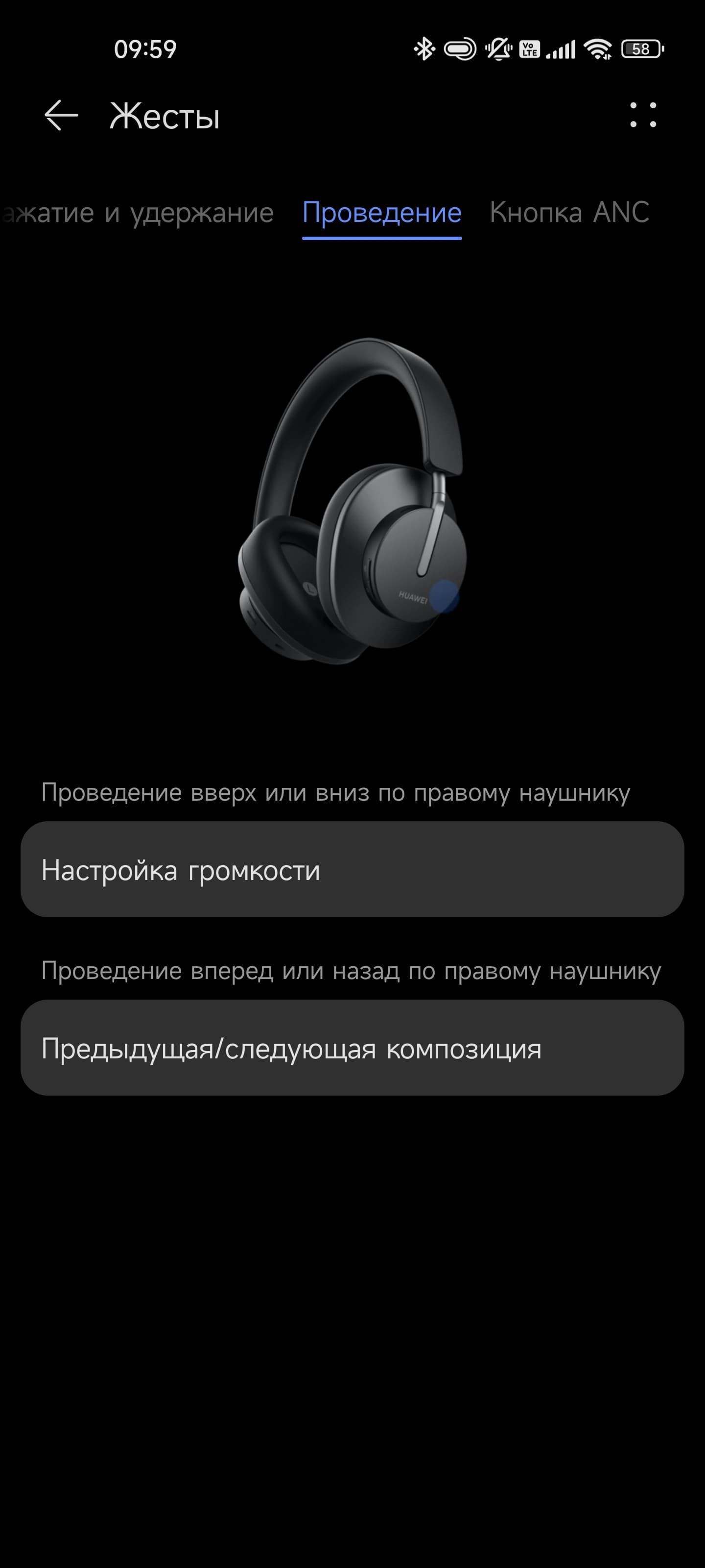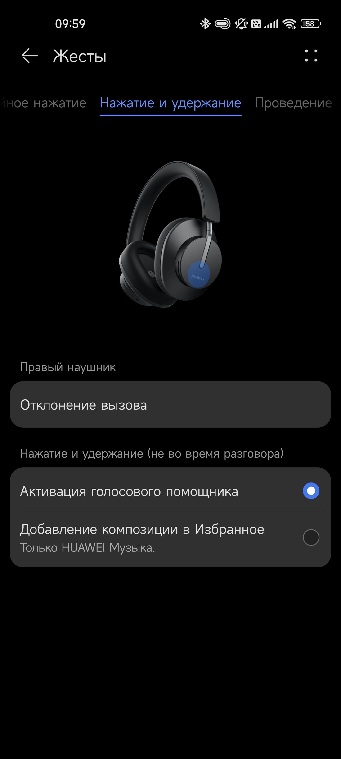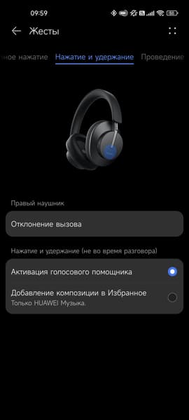 Отдельная вкладка отдана под настройку управления. Вернее, речь идет не столько про настройку, сколько про ознакомление — изменить пользователю предлагается очень немногое. Но страшного в этом ничего нет: управление изначально вполне логичное. На удержание сенсорной зоны можно «повесить» активацию голосового помощника, либо добавление композиции в избранное, но только при использовании сервиса Huawei Музыка — многие пользователи наверняка выберут ассистента, который существенно расширяет возможности управления источником звука (обычно смартфоном). Кнопка переключения режимов работы «шумодавов» меняет их по кругу: выключено — режим шумоизоляции — режим «прозрачности». Если какой-то из вариантов не используется, его можно отключить.
