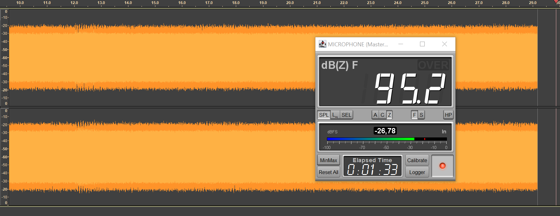 Безопасным уровнем звукового давления при прослушивании музыки считается 75 дБ, но на практике большинство слушателей предпочитает уровень 90-100 дБ. Мы транслируем в наушники белый шум, фиксируя уровень SPL в районе 95 дБ (кстати, получилось как раз примерно 70% от максимального уровня громкости), сразу после старта воспроизведения запускаем запись сигнала с измерительного стенда — по длине получившегося трека легко понять, сколько проработал каждый из наушников.