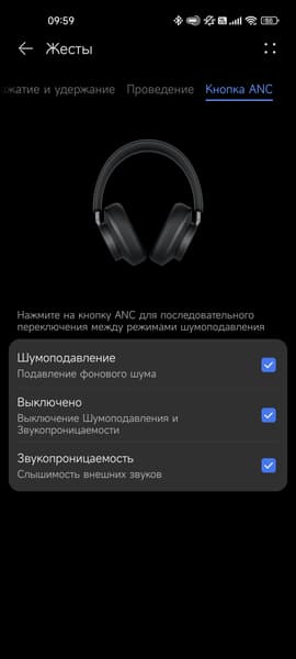 Есть у FreeBuds Studio и физические кнопки. На левой чашке размещена клавиша переключения режимов работы шумоподавления, на правой — кнопки питания и активации Bluetooth-сопряжения. Нажимаются они с небольшим усилием и приятным кликом.