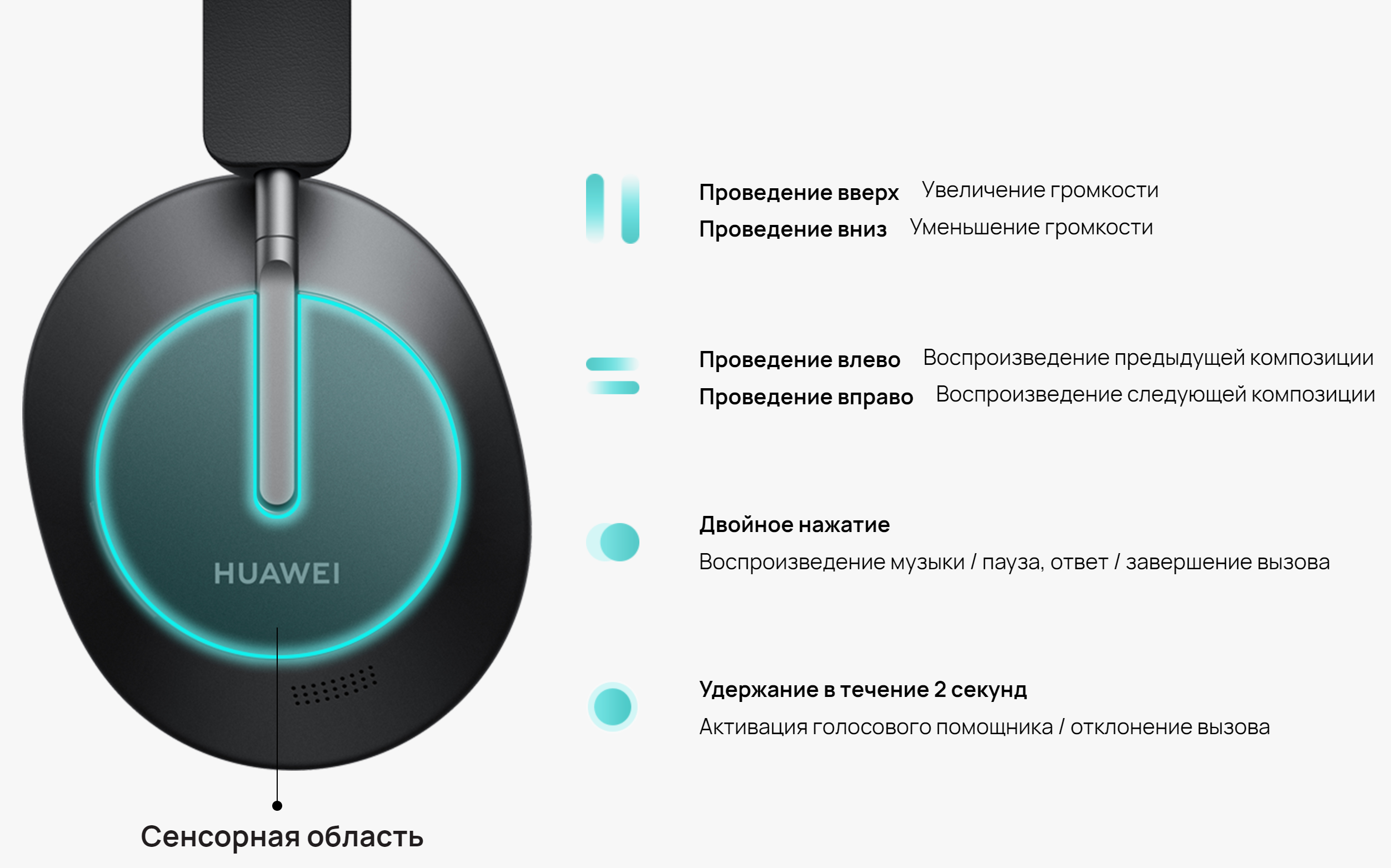 Как уже упоминалось выше, внешняя поверхность правой чашки является сенсорной. Поддерживает она не только касания, но и свайпы. Профиль управления по умолчанию можно увидеть на иллюстрации ниже. Работает сенсор отлично, все жесты регистрируются корректно.
