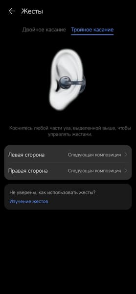Управляется гарнитура прикосновениями к любой из поверхностей — хоть округлой части, хоть фасолевидной, хоть соединяющего их гибкого элемента. Мы условно называем управление сенсорным, но на деле фиксацией касаний явно занимаются микрофоны — совсем легкие прикосновения не регистрируются, зато даже легкие тапы срабатывают всегда. По умолчанию двойным касанием можно включать или останавливать воспроизведение, отвечать на вызов и завершать его. Тройное касание отвечает за пролистывание композиций.