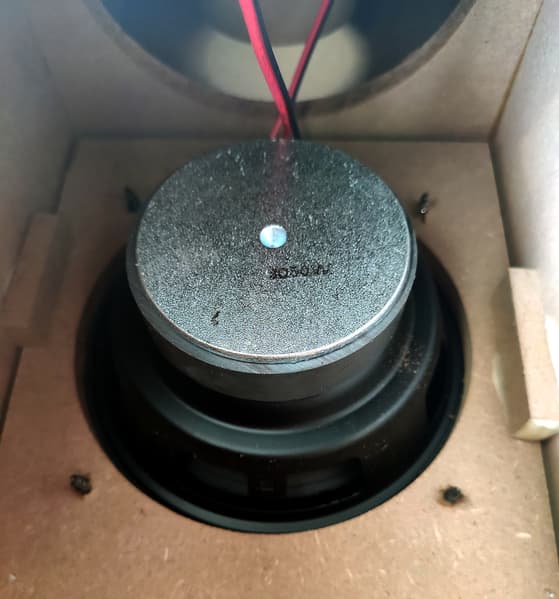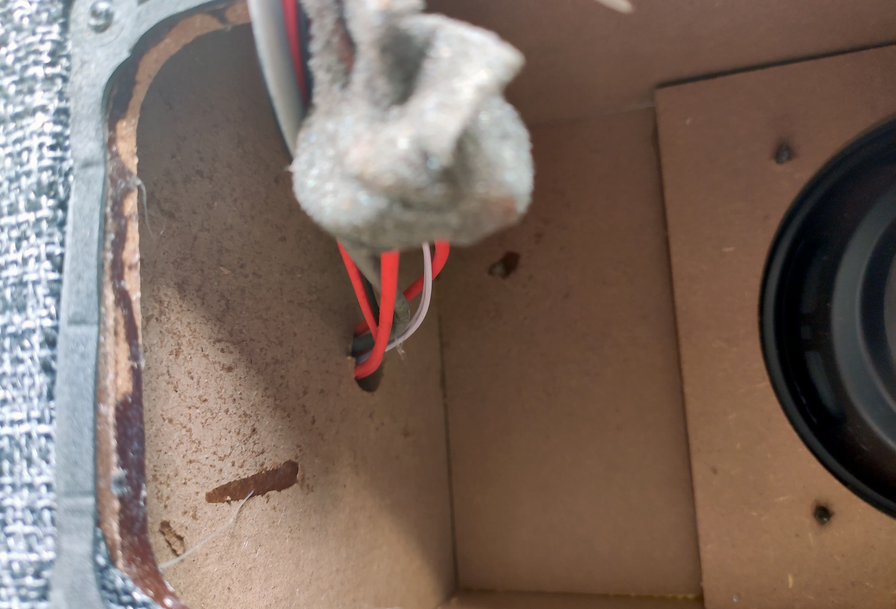Про количество и параметры используемых динамиков тоже ничего не сказано. Нам удалось увидеть лишь центральный — видимо, СЧ. Маркировка на нем неразборчива, но «50W» различить можно легко. Закреплен динамик с помощью шурупов, вкрученных прямо в накладку изнутри корпуса, которая удерживается парой маленьких брусков, приклеенных к боковым стенкам. Решение, возможно, не самое изящное. Но простое и в целом надежное, а потому вполне имеющее право на жизнь.