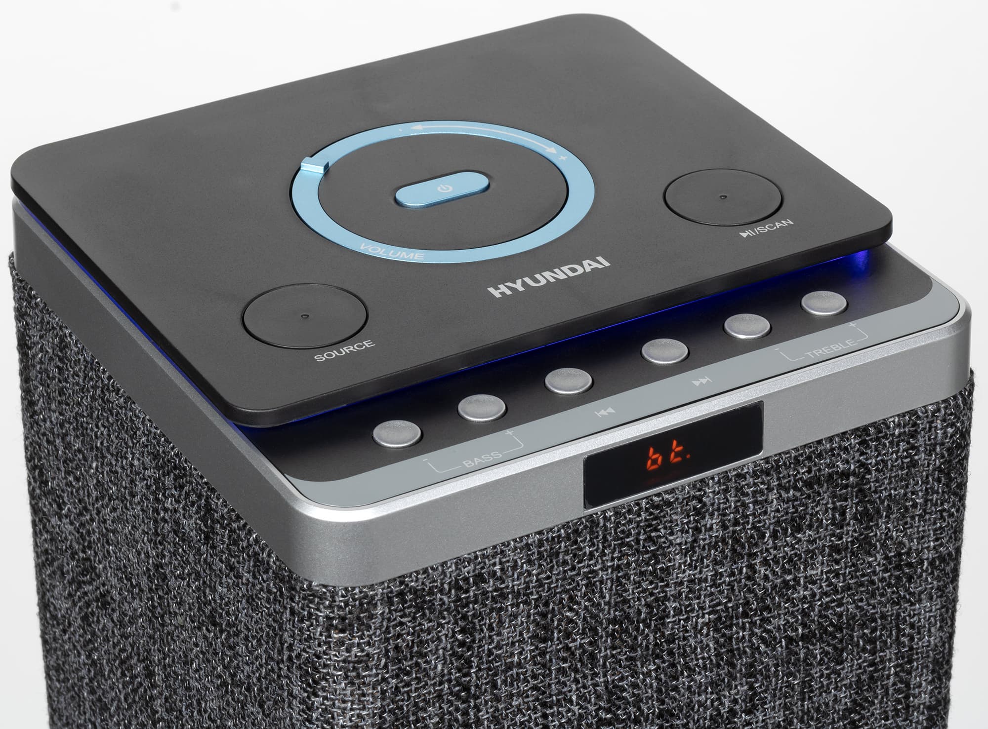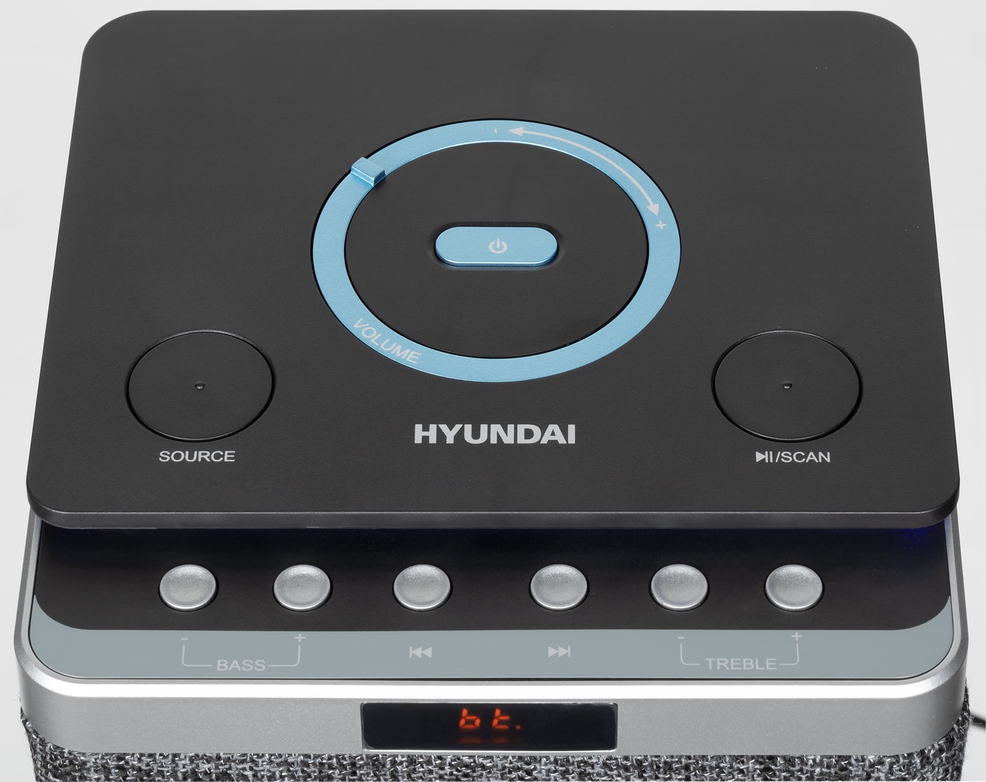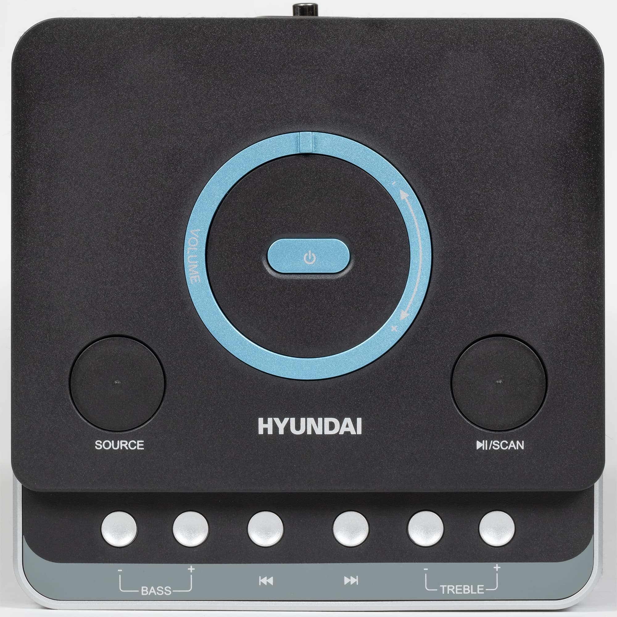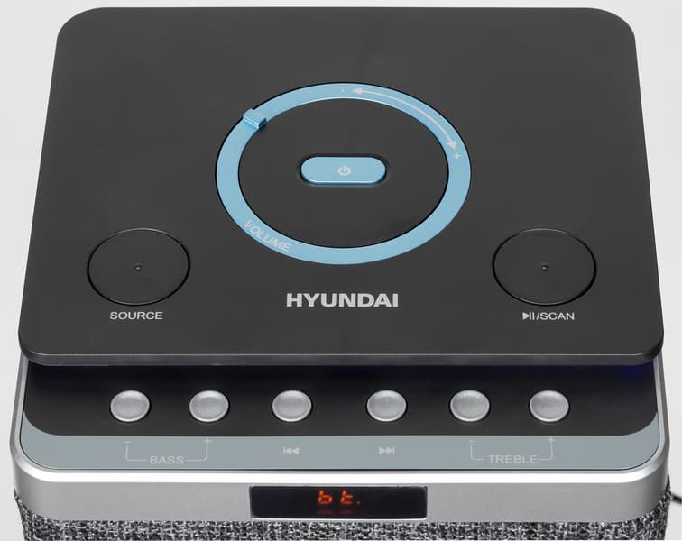 По центру верхней панели устройства размещена кнопка питания, вокруг нее находится довольно оригинальный регулятор громкости — кольцо с небольшим рычажком, представляющее собой валкодер с дискретным ходом без ограничения угла вращения. Ниже размещены две крупных кнопки: одна позволяет выбрать источник звука, вторая — управлять воспроизведением и запускать сканирование эфира в режиме радиоприемника. Ниже расположен ряд одинаковых кнопок, которые позволяют изменять настройки эквалайзера, а также пролистывать треки вперед и назад.