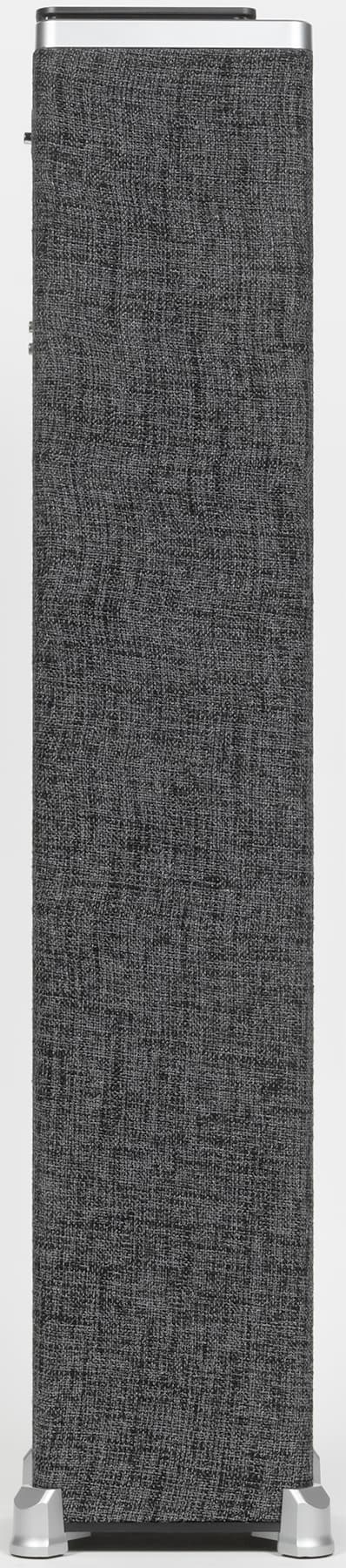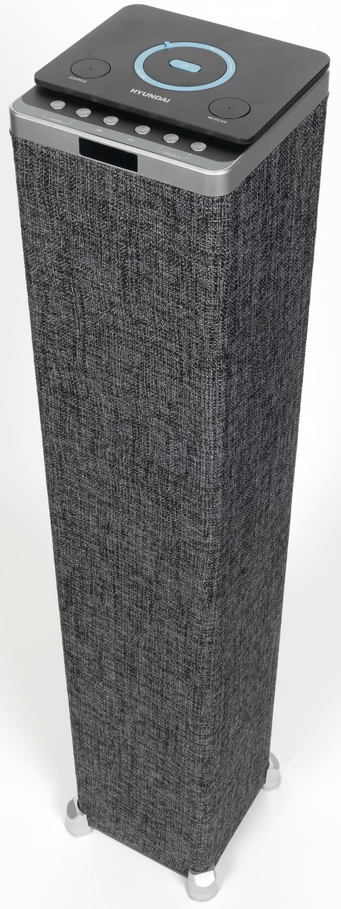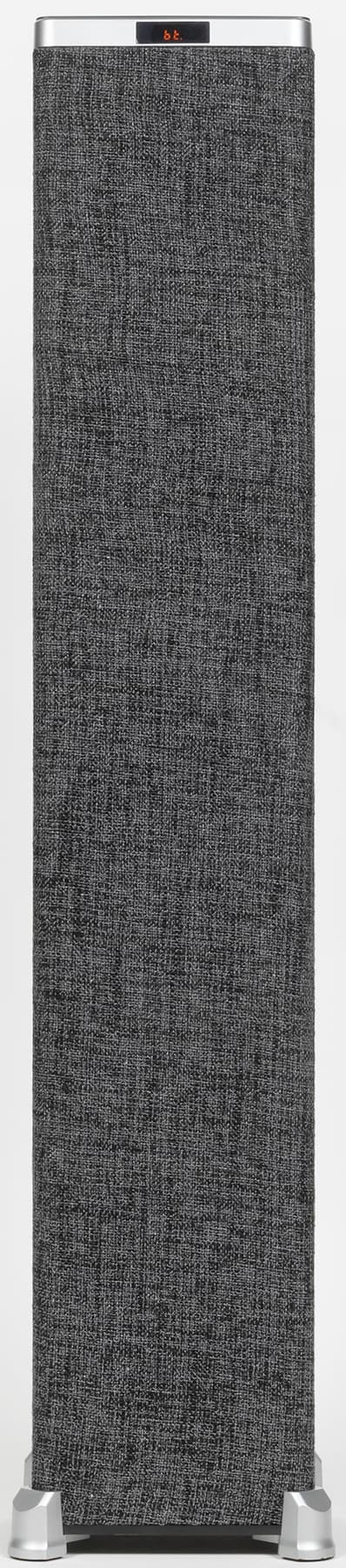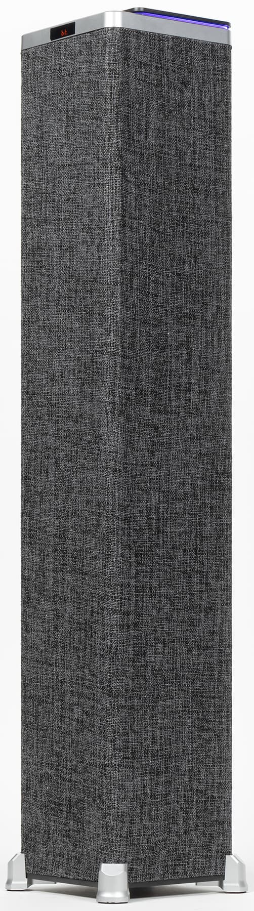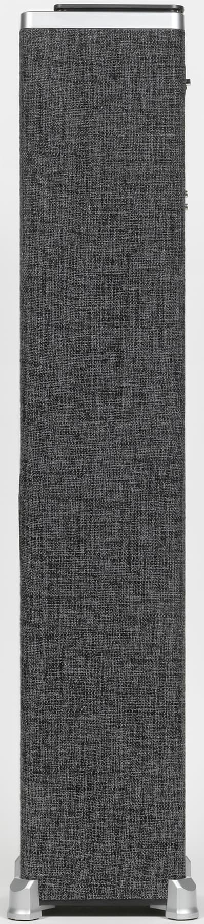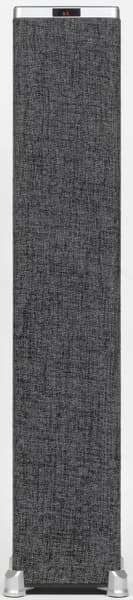 Акустика представляет собой «башню» или «столбик», обтянутый серой тканью. Основание имеет размеры всего 17,5×17,5 см, много места на полу она не займет. А вот высота довольно-таки солидная — 96 см. На верхней поверхности расположена панель управления, спереди находится небольшой экран — обо всех элементах мы подробно поговорим ниже.