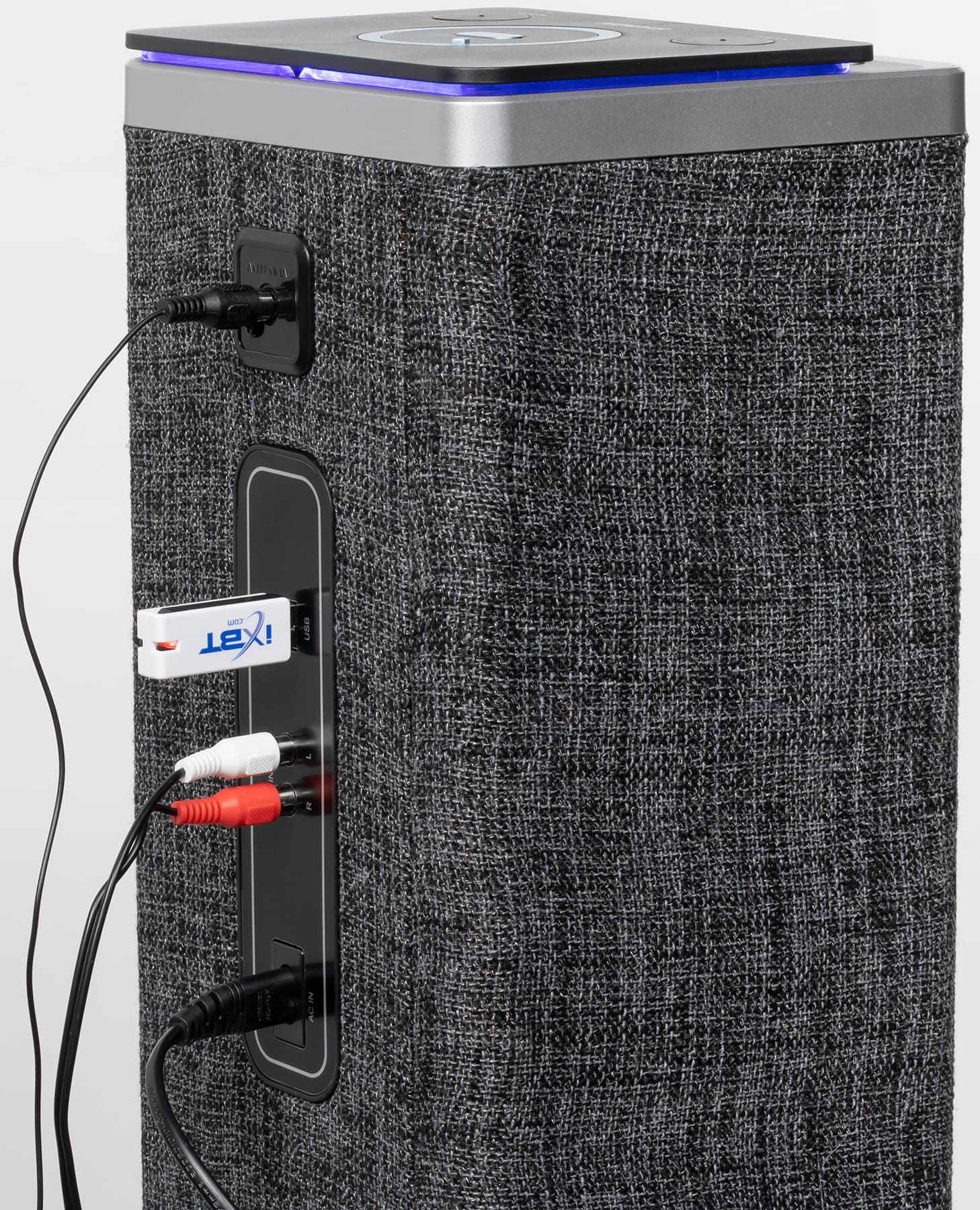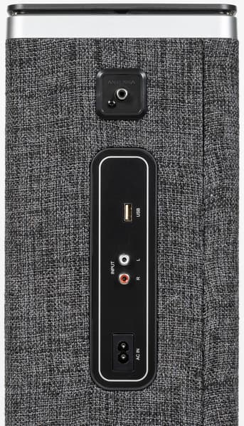 В верхней части задней стенки расположен разъем для присоединения антенны, под ним находится панель с разъемами USB для внешнего накопителя и RCA для аналогового подключения к источнику звука, здесь же находится гнездо кабеля питания.