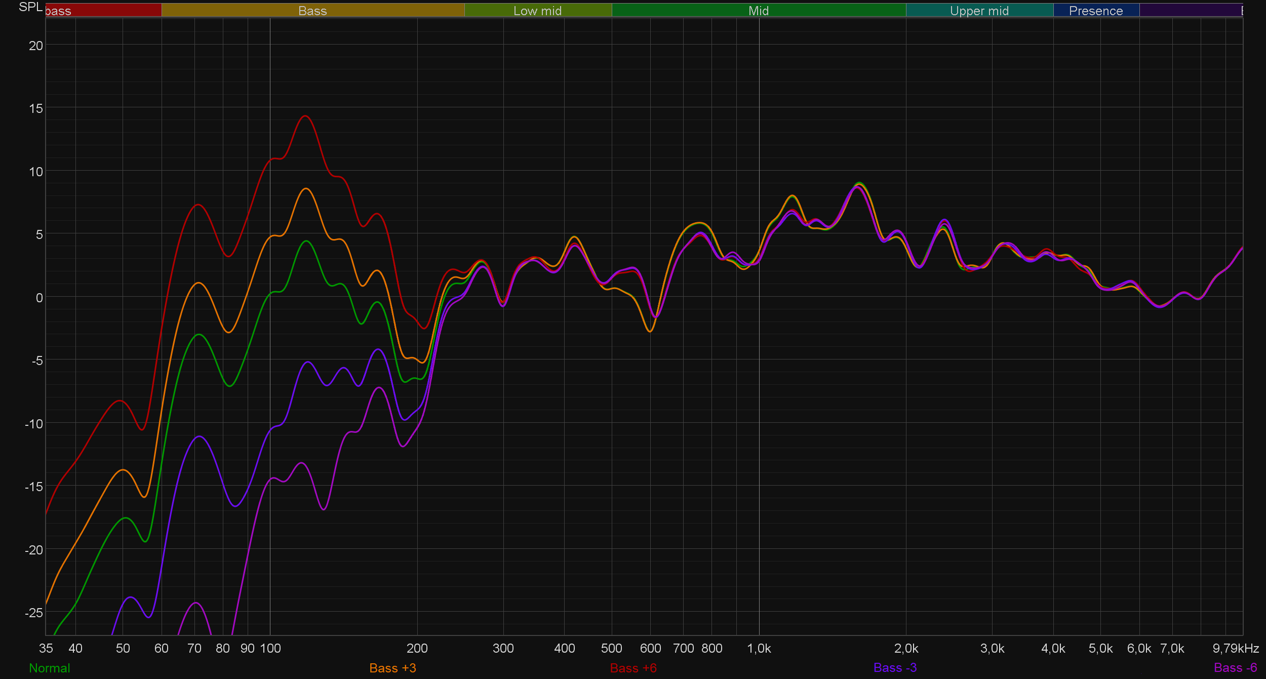 Видно, что работают регуляторы весьма эффективно: специфика звучания диапазона, конечно, не меняется, а вот акцентом на нем можно управлять в весьма широких пределах. Примерно то же самое происходит с высокими частотами при изменении значений регулятора Treble.