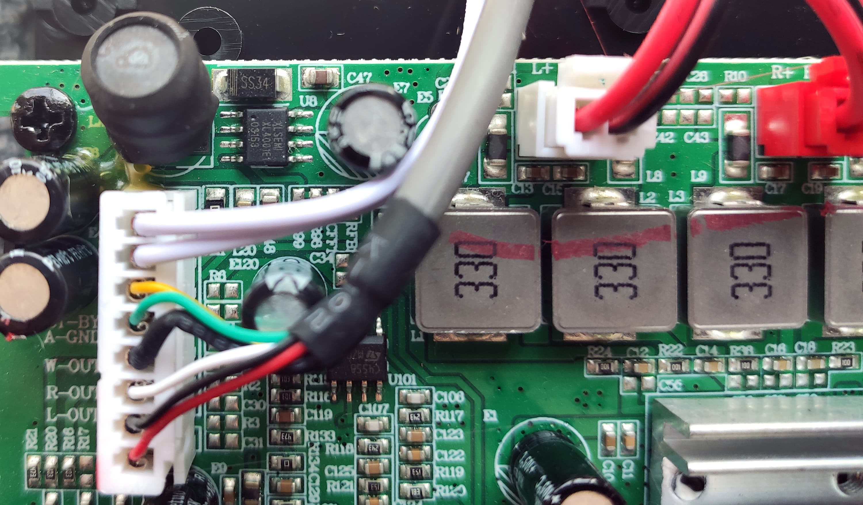Собрано все вполне качественно, в левой средней части платы расположена пара усилителей C4558. Выше виден преобразователь DC/DC.