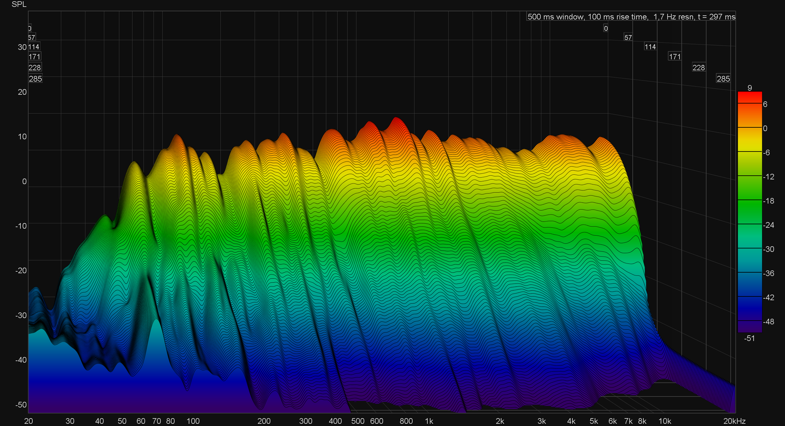 Как говорится, нагляднее не придумаешь. Более-менее полноценное воспроизведение низкочастотного диапазона стартует где-то с 70 Гц, при этом «горб» в районе 120 Гц и провал около 200 Гц добавляют немного «ударности» басу, но в то же время создают ощущение гулкости. А теперь давайте сразу посмотрим на график кумулятивного затухания спектра (он же «водопад», waterfall).