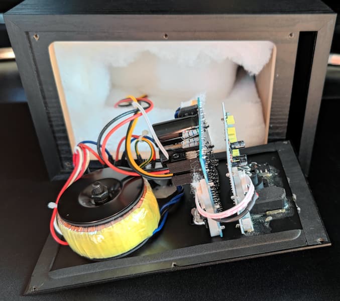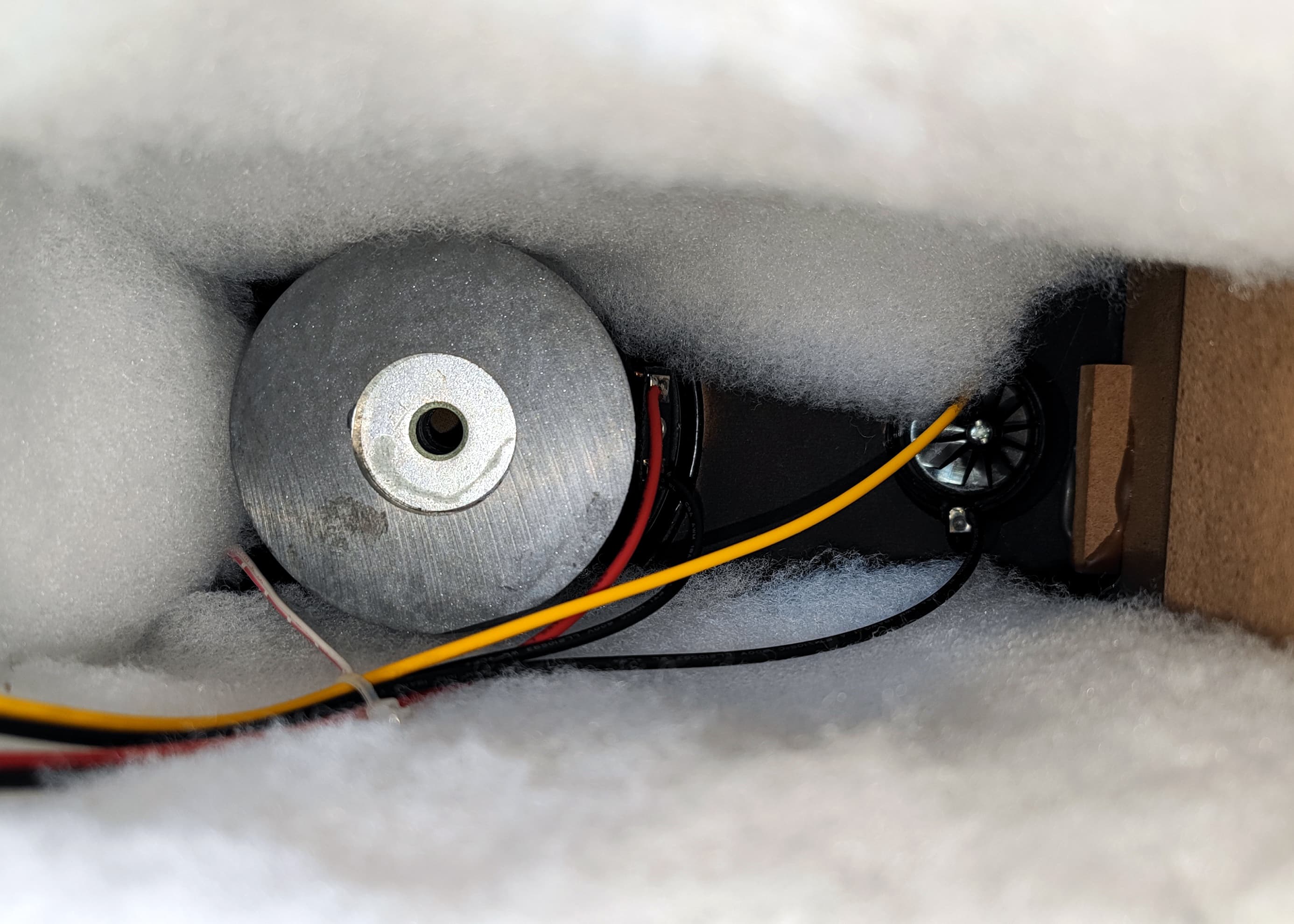 Внутреннее пространство корпуса практически полностью закрыто толстым слоем синтепона, помогающего избавиться от лишних резонансов. Ниже мы увидим, что со своей функцией звукопоглотитель прекрасно справляется.