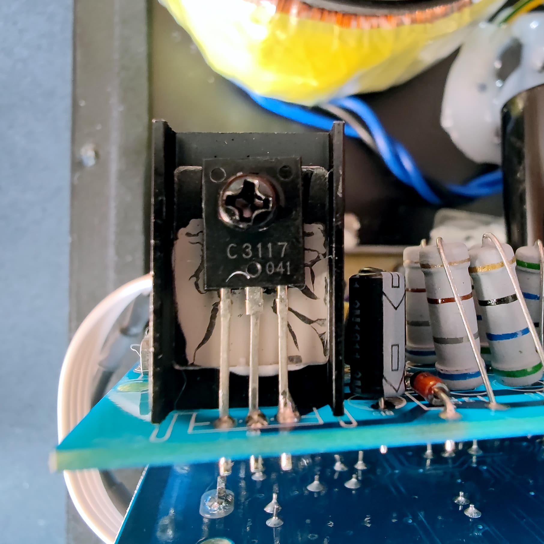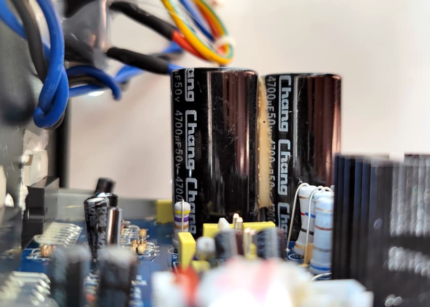 На нижней отметим электролитические конденсаторы китайского бренда Chang и пару транзисторов C3117 с собственными маленькими радиаторами, на которых видны следы термопасты. Компоненты, конечно, по большей части китайских производителей — громких имен тут нет, да и быть не может, все же акустика довольно-таки бюджетная.