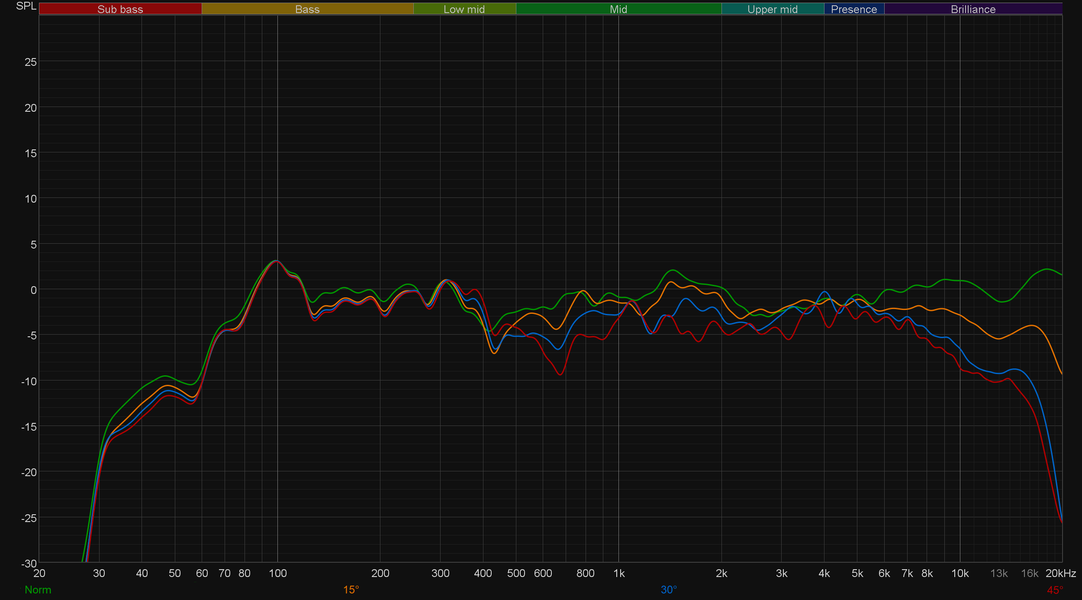 Посмотрим, как обстоит дело с горизонтальной дисперсией звука. Поворот на 15° в сторону от микрофона приводит лишь к небольшому «проседанию» самой верхней части воспроизводимого диапазона — для мониторов ближнего поля это уже очень и очень неплохо. Ну а продолжать уже явно не стоит, что прекрасно видно по графику. Как и всегда, направлять мониторы нужно непосредственно на слушателя.