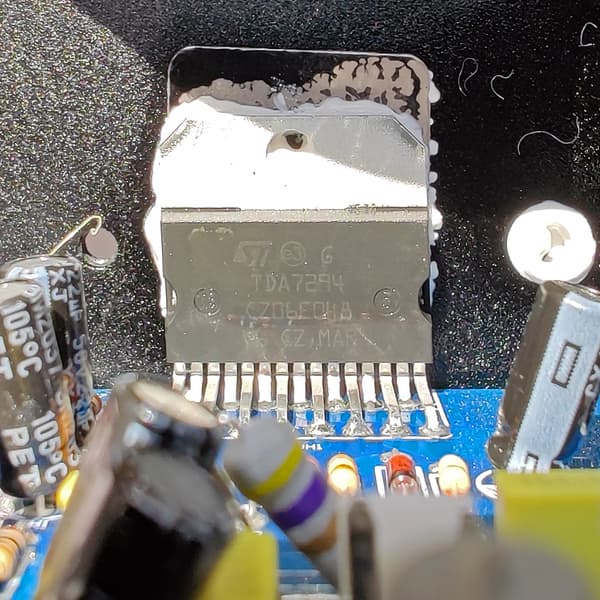 Ну и теперь мы можем увидеть маркировку — перед нами два усилителя TDA7294 (STMicroelectronics).