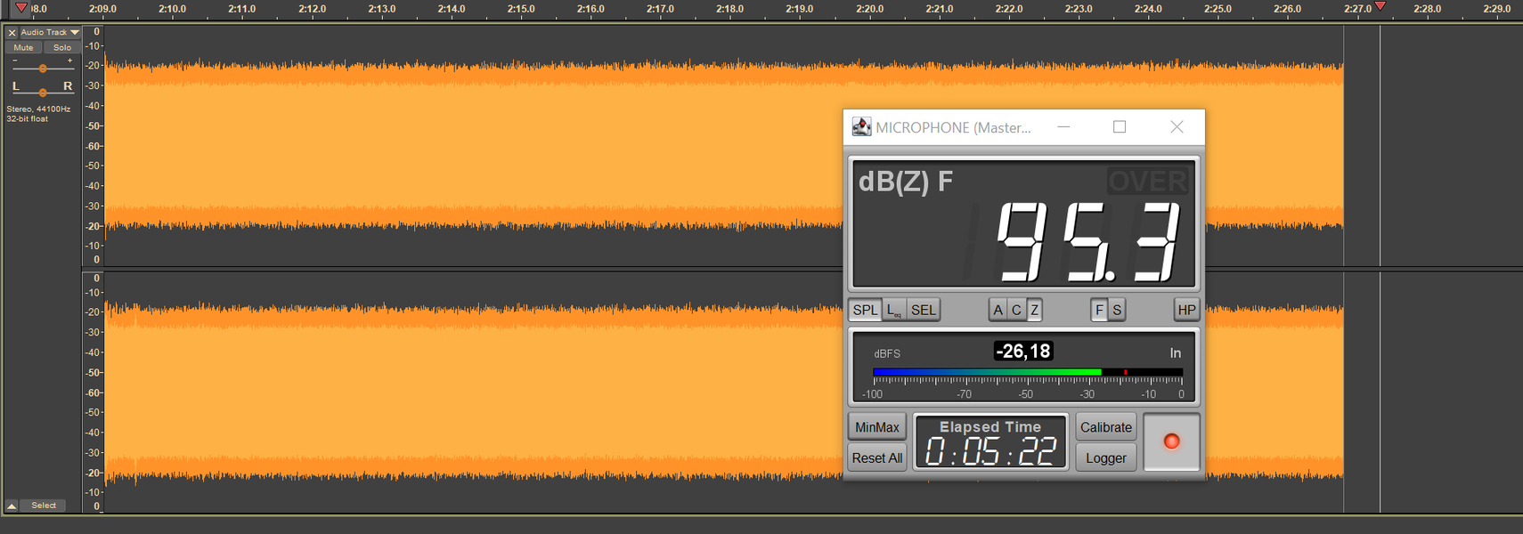 Безопасным уровнем звукового давления при прослушивании музыки в наушниках считается 75 дБ, но на практике большинство слушателей предпочитает уровень 90-100 дБ. Мы транслируем в наушники белый шум, фиксируя уровень SPL в районе 95 дБ, сразу после старта воспроизведения запускаем запись сигнала с измерительного стенда — по длине получившегося трека легко понять, сколько проработало устройство.
