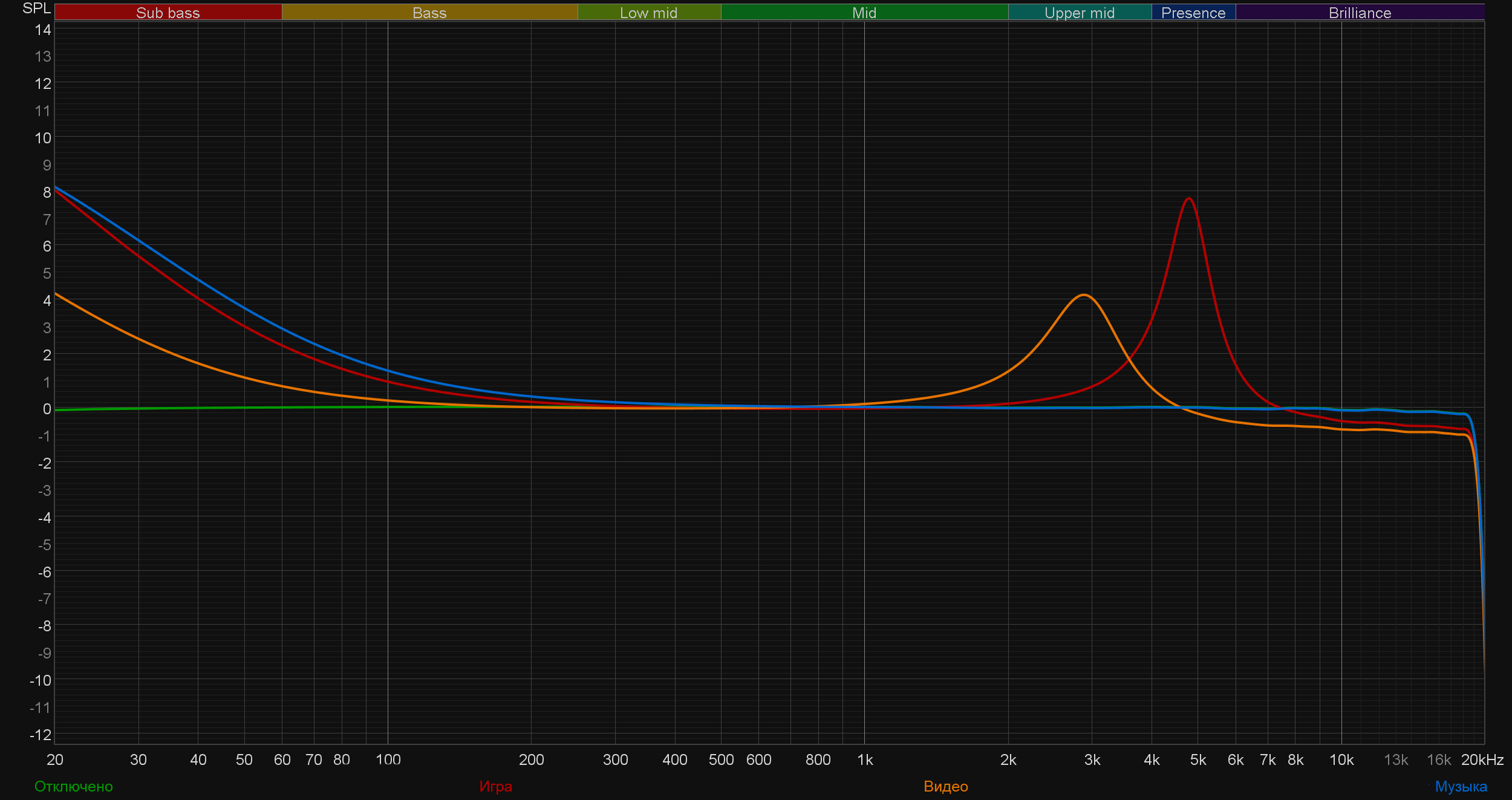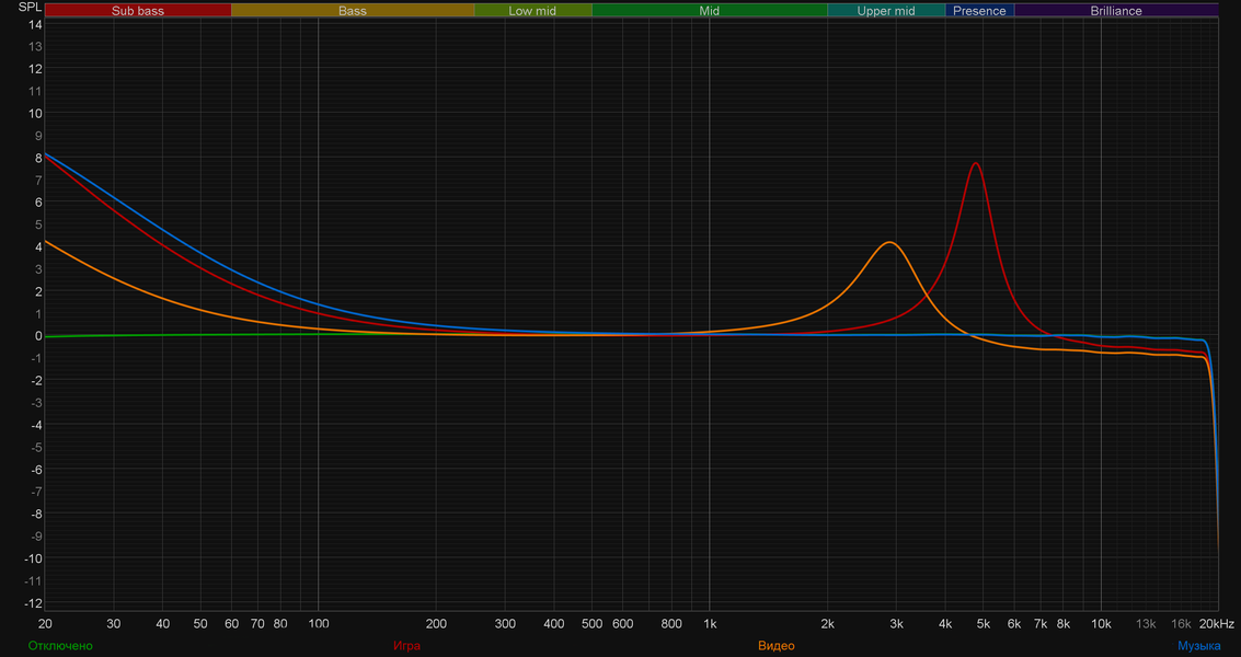 - Режим «Игра» также основательно выводит вперед бас, плюс делает серьезный акцент на частотах в районе 5 кГц, чтобы придать звуку так называемой яркости.