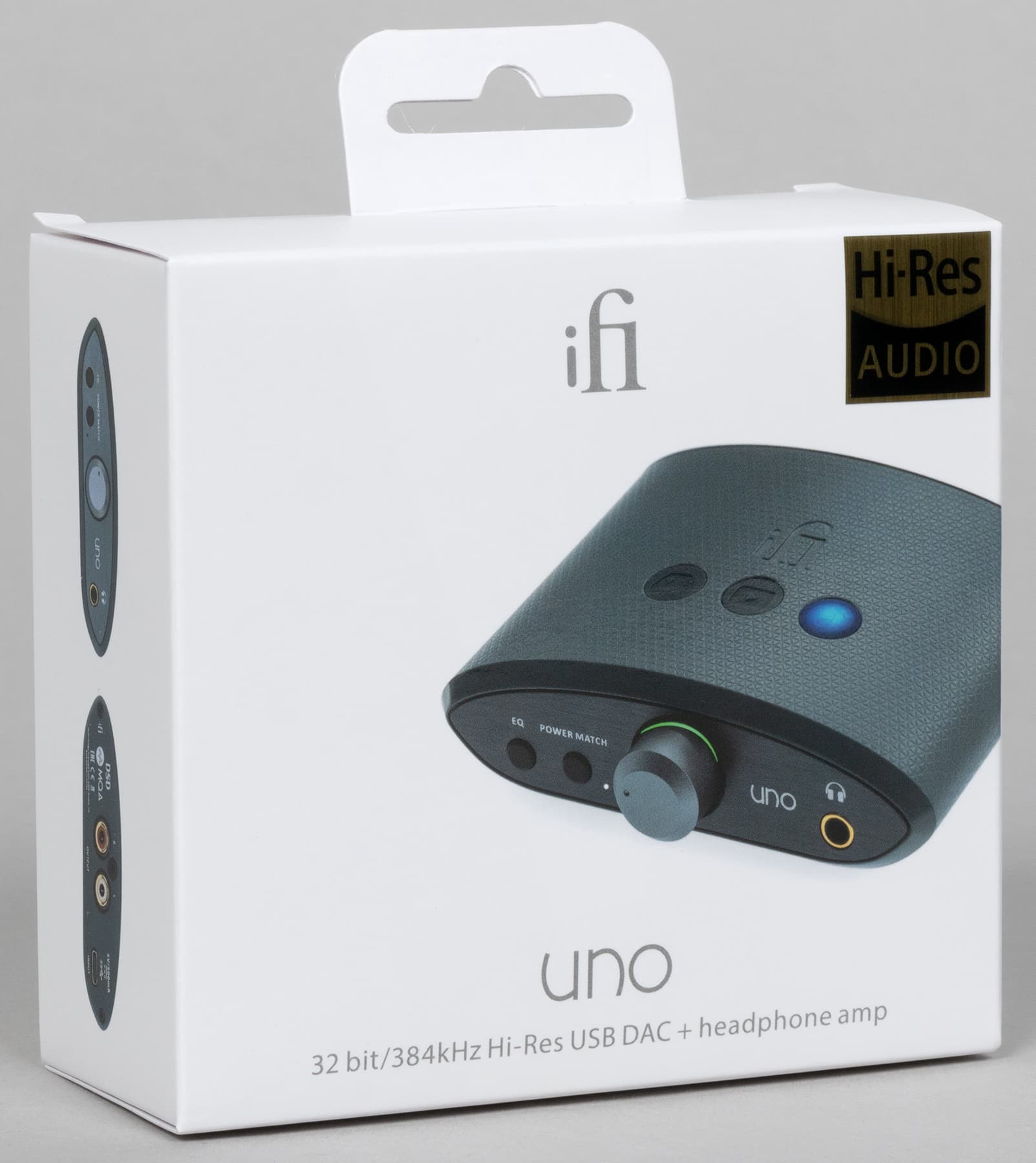 Упакован iFi Uno в простенькую белую коробку из картона средней плотности, на которую нанесены изображения устройства, краткая информация о нем, логотипы производителей и систем сертификации. Внутри «цапоусилитель» и прочие элементы комплектации удерживаются с помощью картонного ложемента.