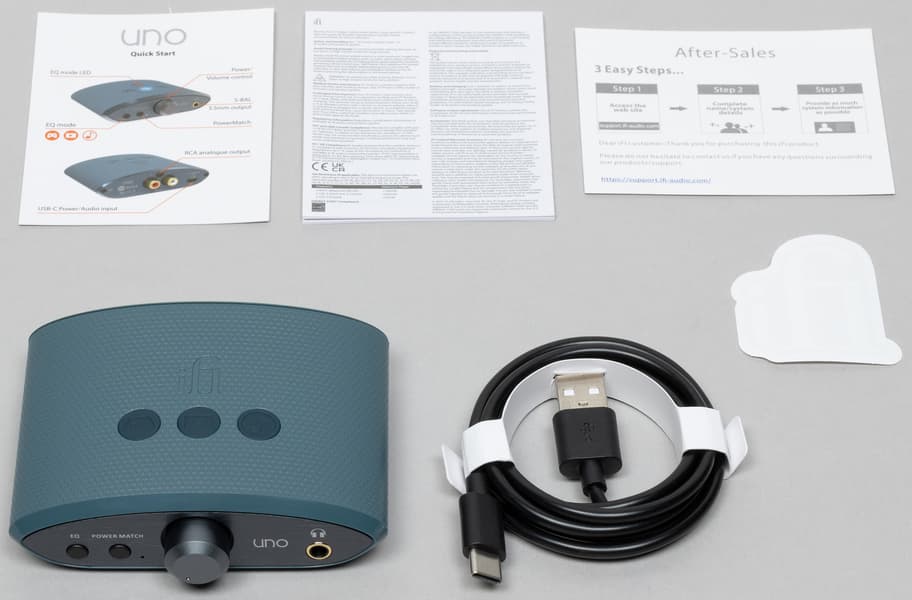 В комплект поставки помимо самого iFi Uno входят документация, фирменная наклейка и кабель USB-A — USB-C длиной 120 см. Комплектация не самая богатая, зато кабель качественный и нормальной длины — положен в коробку не «для галочки», а с мыслью о том, что покупатель реально будет им пользоваться.
