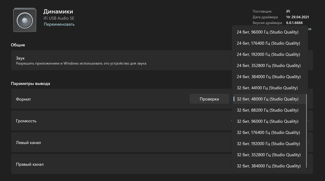 Подключение к ПК можно осуществить с помощью комплектного кабеля, на сайте производителя доступы для скачивания драйверы, добавляющие поддержку ASIO — если она не нужна, их вполне можно и проигнорировать, все будет работать и так. Устройство корректно определяется, все заявленные форматы поддерживаются. В частности, прекрасно воспроизводится формат MQA, основным источником которого служит стриминговый сервис Tidal. Полное декодирование предсказуемо не поддерживается, iFi Uno выступает как MQA-рендерер.