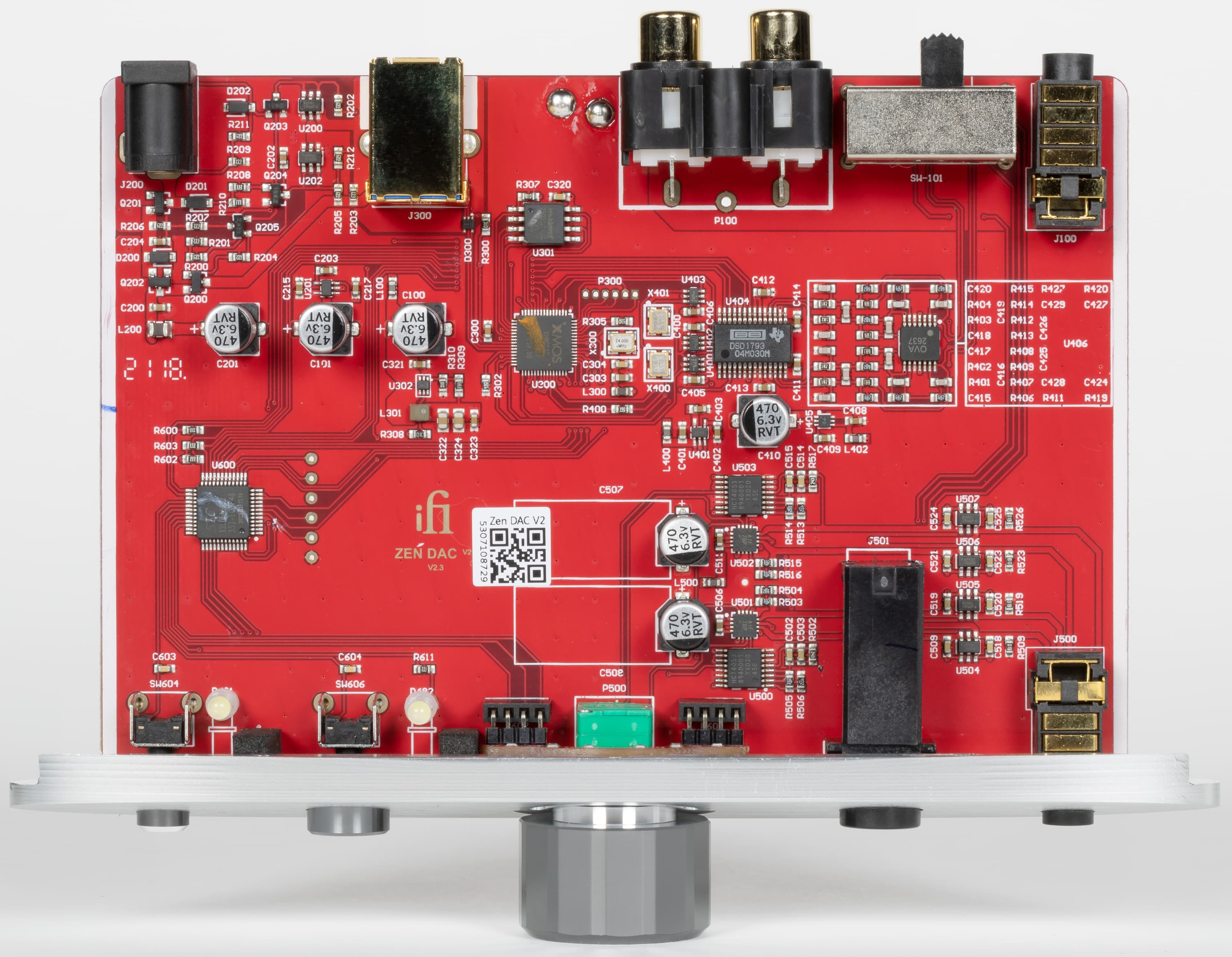 Практически по центру расположилась чуть ли не главная «обновка» второй версии iFi Zen DAC — 16-ядерный микроконтроллер XMOS, пришедший на смену 8-ядерному «коллеге». Увеличение вычислительной мощности, в частности, позволило обеспечивать полное декодирование формата MQA прямо на борту, тогда как базовая модель могла выступать только в качестве рендерера — декодирование выполнял подключенный к ней компьютер. Левее видна флеш-память Winbond Electronics 25Q32FVSIG.