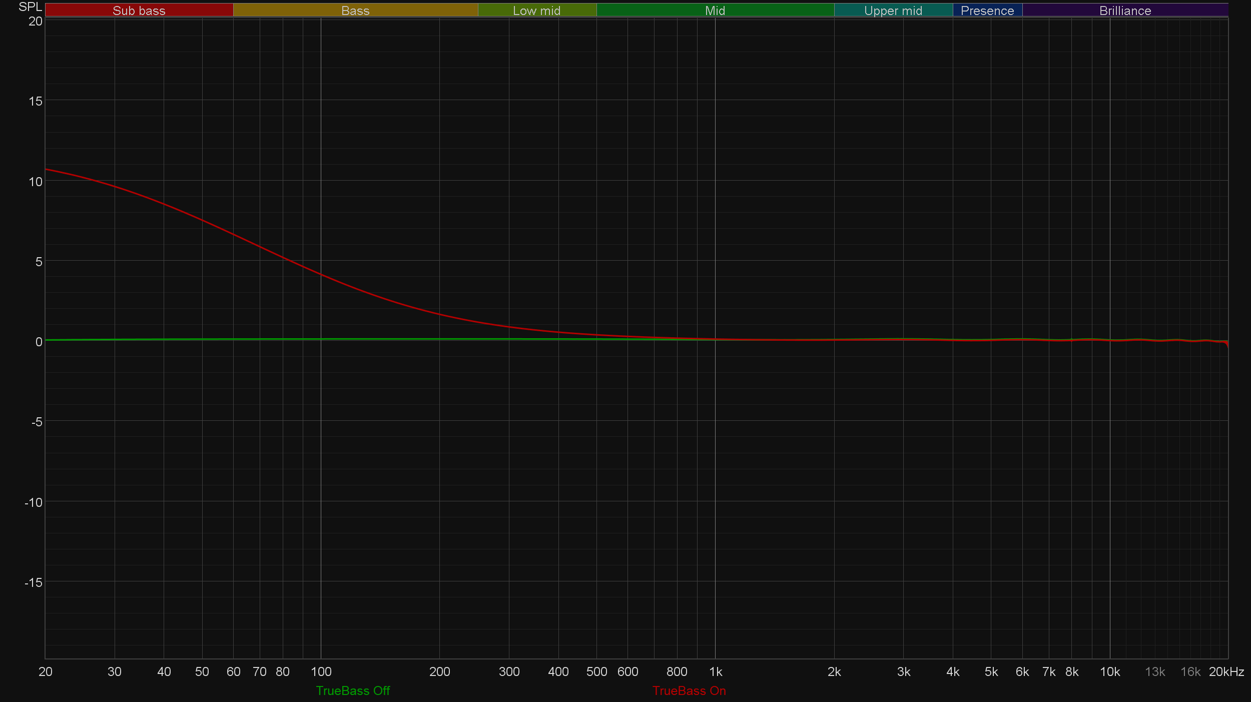 Как легко заметить, включение функции действительно приводит к появлению довольно значительного акцента на низкочастотном диапазоне, при этом чем ниже частота — тем основательнее она подчеркивается. Бас при этом остается на удивление собранным — без «бубнения». Бассехдам понравится точно, нам в IEM и закрытых наушниках акцент на НЧ-диапазоне показался чуть излишним, а вот в традиционно не самых басовитых открытых он воспринимается очень хорошо.