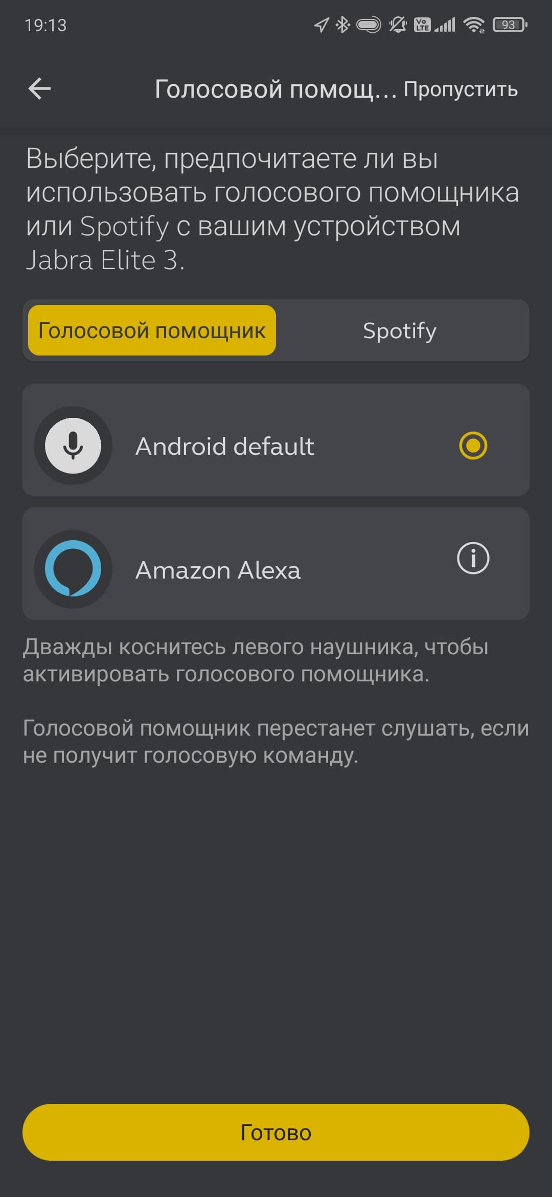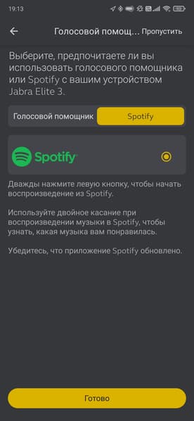 После установки пользователю предлагается выбрать действие, которое будет осуществляться под двойному нажатию левой кнопки — вызов голосового помощника или управление приложением Spotify. С голосовым помощником все просто — Alexa в России недоступна, выбрать ее нельзя, запускается установленный по умолчанию ассистент. А вот со Spotify интереснее: если приложение не запущено — оно запускается и начинает воспроизводить последний проигрывавшийся трек. А если запущено — переходит к проигрыванию списка рекомендаций.