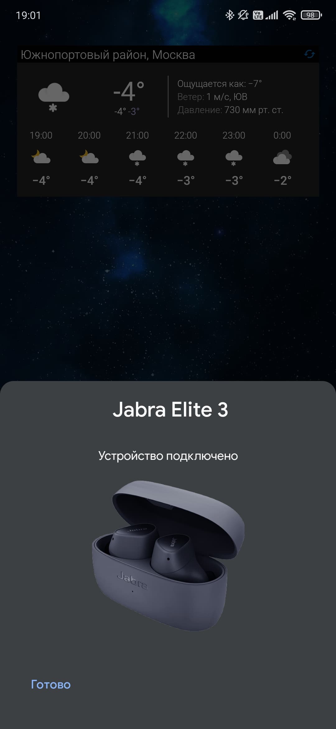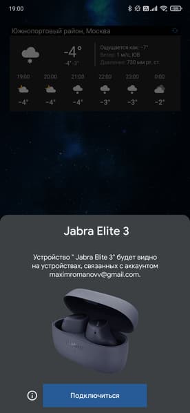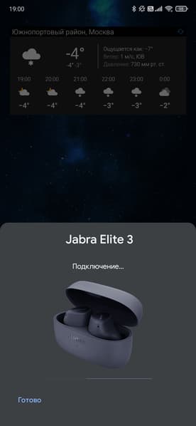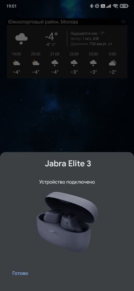 Подключение Jabra Elite 3 к устройствам под управлением Android осуществляется просто и легко, так как она поддерживает Google Fast Pair. Вынимаем гарнитуру, ждем немного — она пробует подключиться к «знакомым» устройствам, потом активирует режим сопряжения. Далее видим всплывающее окно с предложением подключиться, соглашаемся — и готово. Ну а если что-то вдруг не сработало, всегда можно воспользоваться «классическим» методом — через соответствующее меню гаджета.