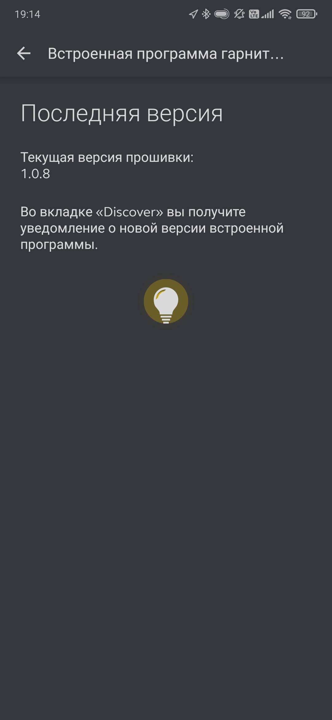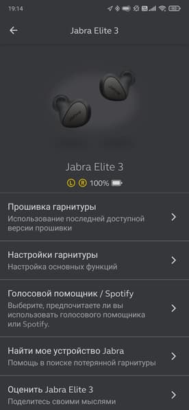 На главном экране доступна информация о зарядке гарнитуры, правда узнать можно только общий уровень — как там дела у каждого наушника по отдельности выяснить не удастся, но это цифра нужна только редким пользователям, которые постоянно используют наушники в монорежиме. По иконке шестеренки в правом верхнем углу доступно меню настроек, наполнение которого видно на скриншоте. В частности, можно обновить прошивку.