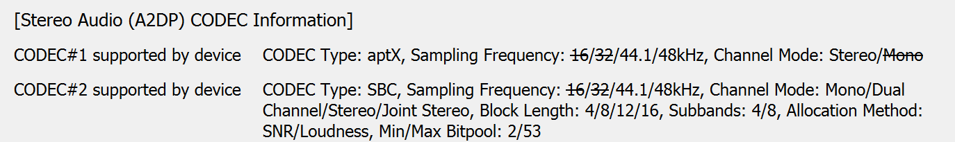 Сразу отметим, что гарнитура явно оптимизирована под работу с Android-устройствами, видно это даже по кодекам — только SBC и aptX, AAC нет и в помине. Полный список поддерживаемых кодеков и их режимов мы традиционно получили с помощью утилиты Bluetooth Tweaker.