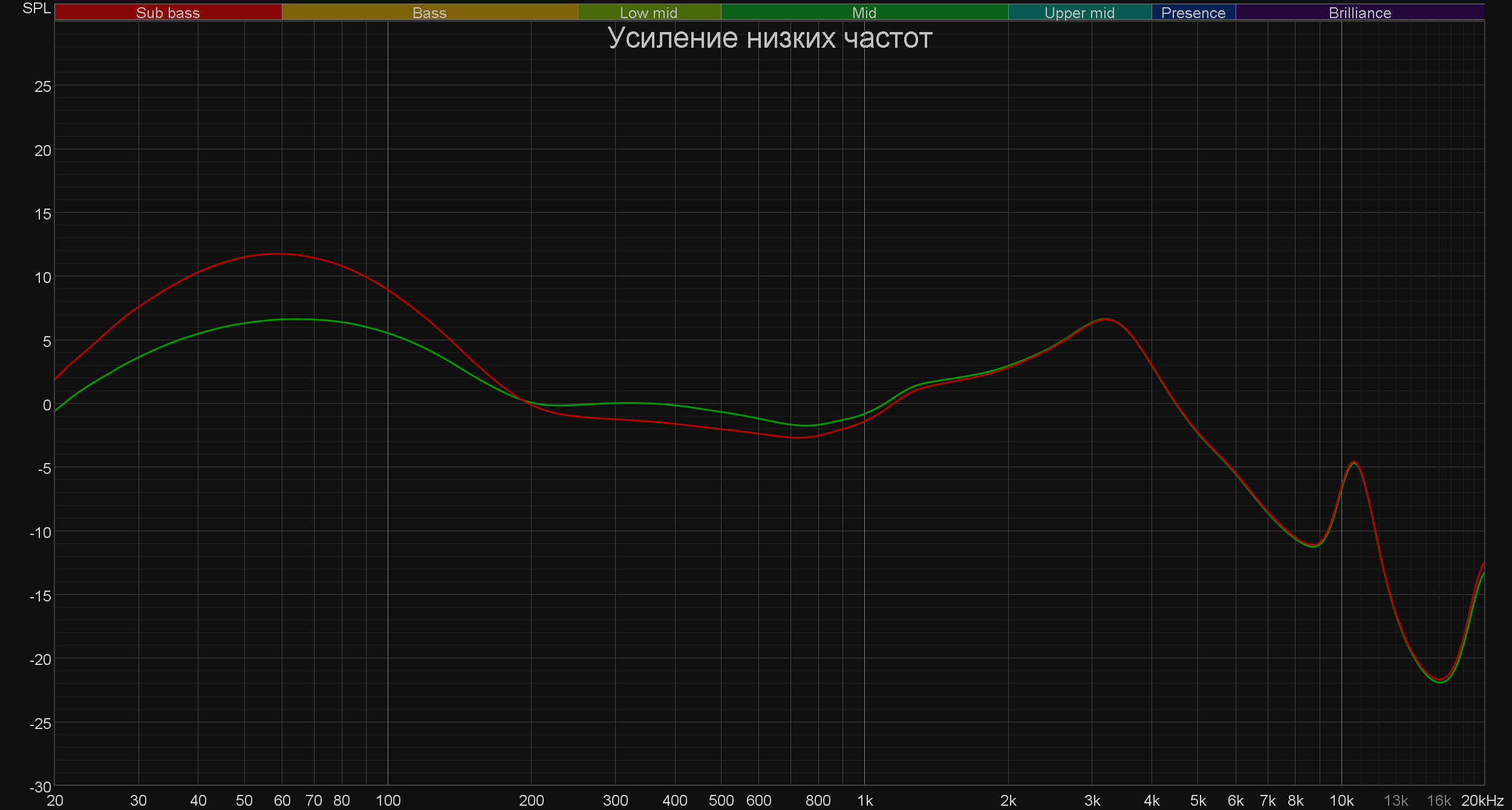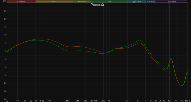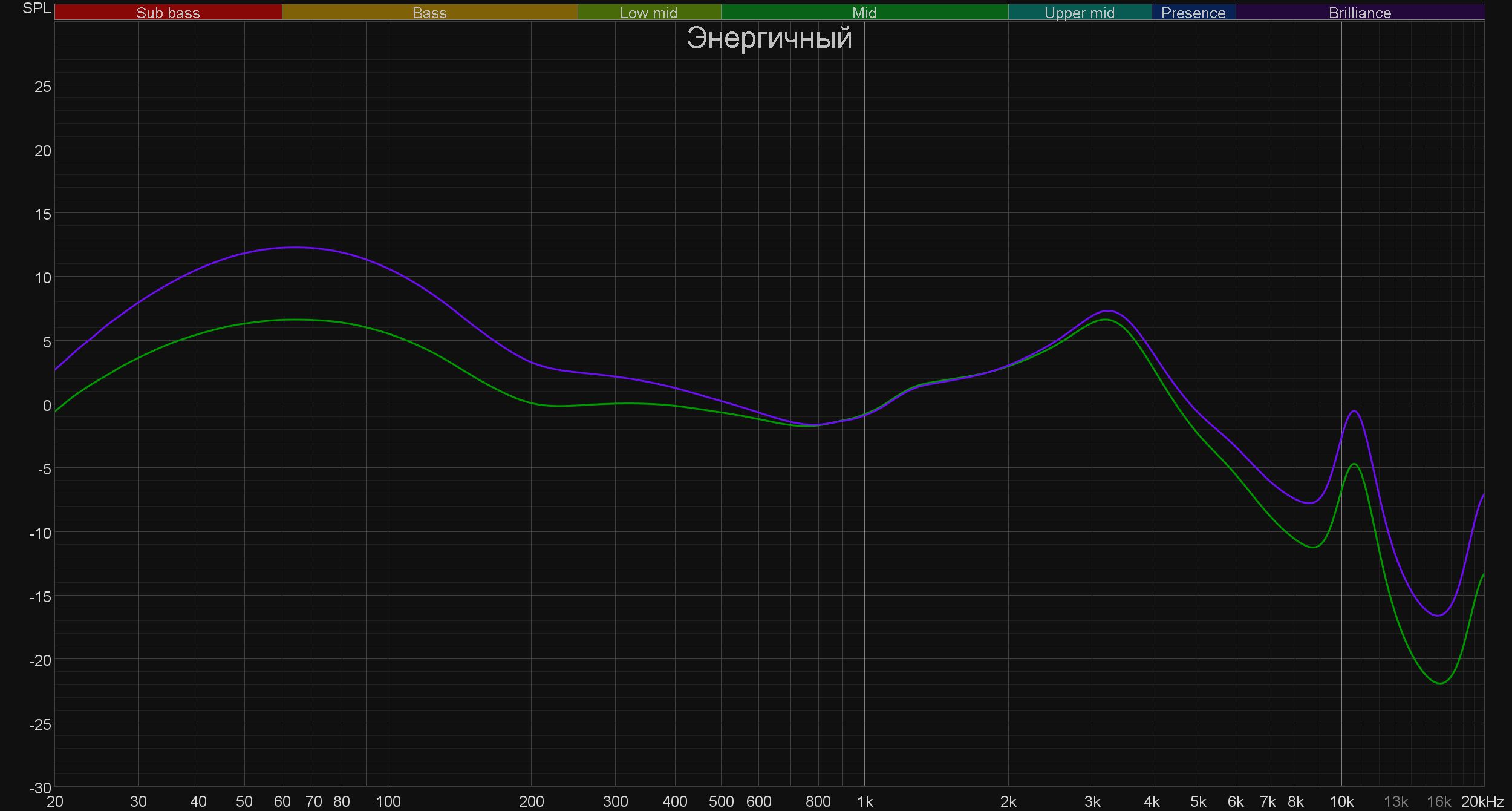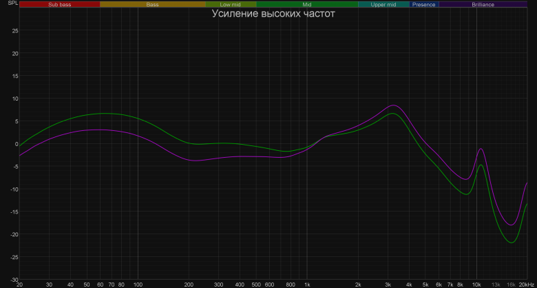 В таком видео все еще более наглядно, надо лишь напомнить, что к изрезанности графика в верхней части диапазона не стоит относиться слишком серьезно. В остальном иллюстрация хорошо описывает субъективные впечатления от прослушивания гарнитуры. Ну а нам осталось взглянуть на работу предустановленных профилей эквалайзера. Покажем АЧХ в каждом из режимов на фоне графика в положении «Нейтральный», который был выбран нами в качестве основного.