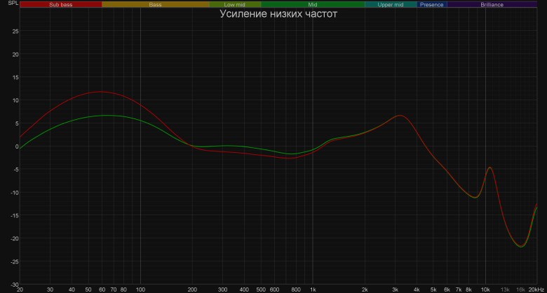 Пресет «Усиление низких частот» согласно названию основательно выводит вперед бас, немного проваливая при этом середину. «Ровный» же наоборот делает акцент на СЧ-диапазоне, достигая несколько большей разборчивости вокала и солирующих инструментов. В пресете «Речь» бас и нижняя часть середины основательно уводятся назад. «Усиление высоких частот» происходит в основном также за счет ослабления середины и НЧ-регистра. Ну и, наконец, «Энергичный» заметно поднимает уровень баса и нижней середины — поклонникам танцевальной музыки такое может прийтись по душе.