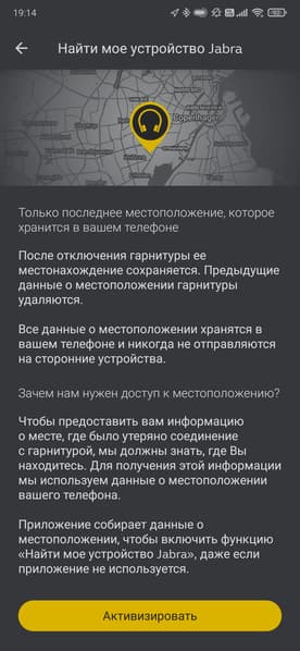 Также можно включить так называемый Sidetone — опцию трансляции голоса пользователя в наушники во время телефонного разговора. Это должно повысить комфорт общения, но тут на любителя — кому-то нравится, кому-то нет. Также есть возможность сохранять информацию о месте, где в последний раз была разорвана связь с Jabra Elite 3 — пригодится, если где-нибудь забыть гарнитуру. Работает все вполне корректно, но придется дать разрешение на доступ приложения к местоположению, без этого никак. Тут уж выбор за пользователем.