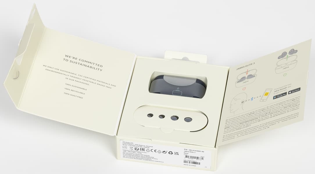 Крышка откидывается влево, под ней обнаруживается еще одна, откидывающаяся вправо. На последнюю нанесена краткая инструкция по подключению. Кейс с наушниками и комплект дополнительных силиконовых насадок удерживаются картонными ложементами. Кстати, вся упаковка сделана из картона, пригодного для переработки, о чем на упаковке сообщено отдельной строкой.
