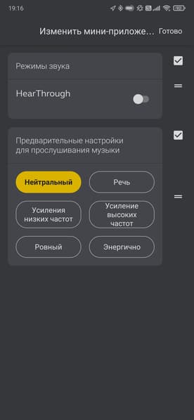 Вернемся на главный экран, где мы видим кнопку включения функции HearThrough, ниже размещены переключатели пресетов эквалайзера. К сожалению, полноценного эквалайзера тут нет, но предустановки дают возможность подстроить звук если и не под собственный вкус, то хотя бы под текущую ситуацию. В нижнем меню приложения есть еще две вкладки, содержащие разного рода вспомогательную информацию.