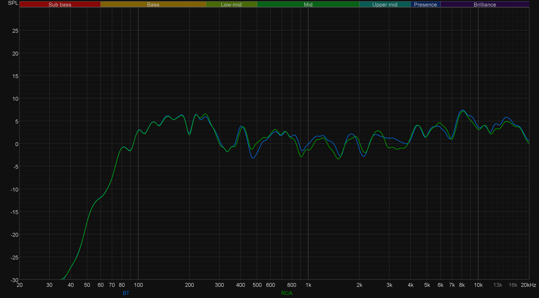 Ну и, наконец, сравним АЧХ при использовании проводного и беспроводного подключения. Различия есть, они заметны, но общая форма графиков остается неизменной.