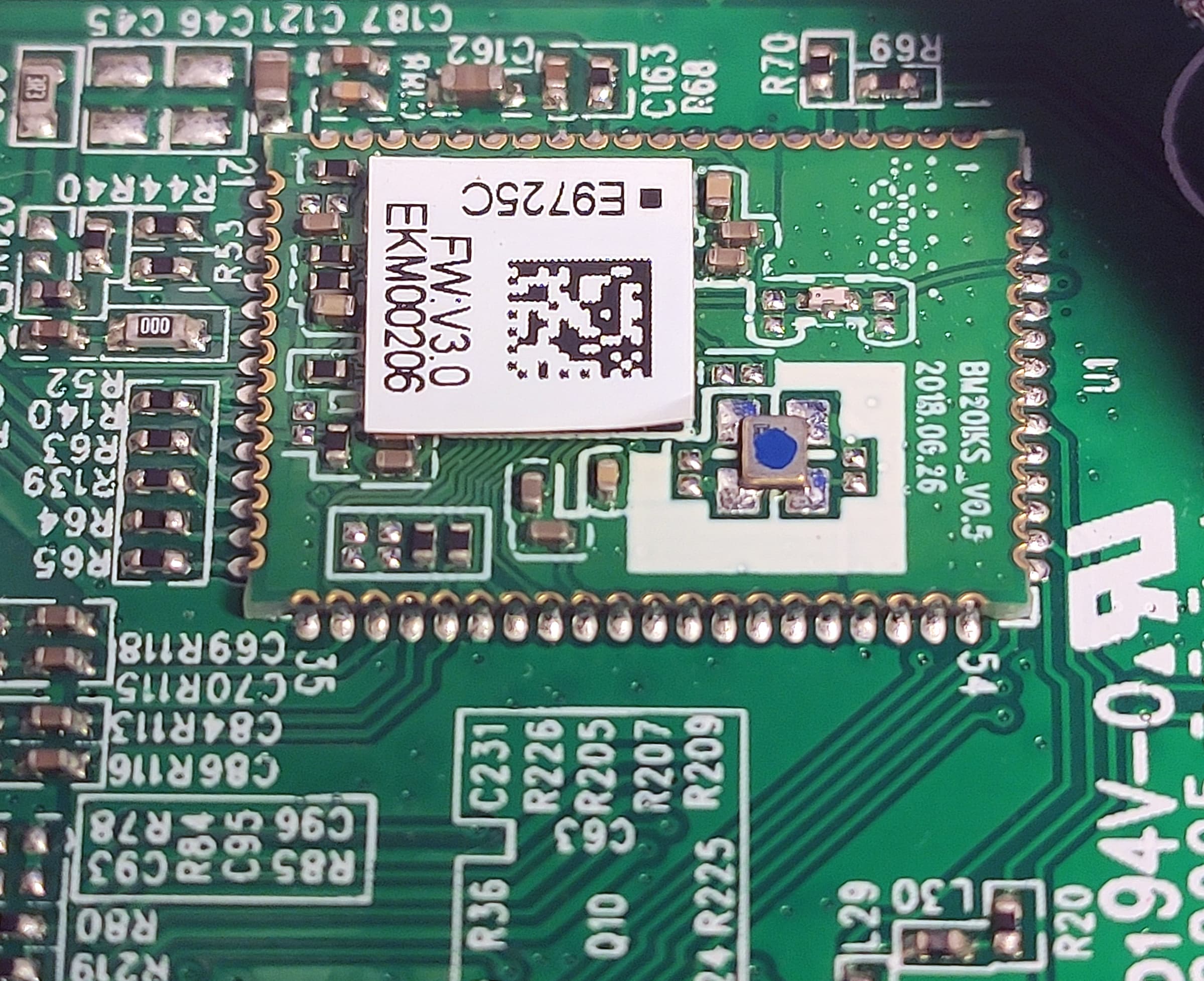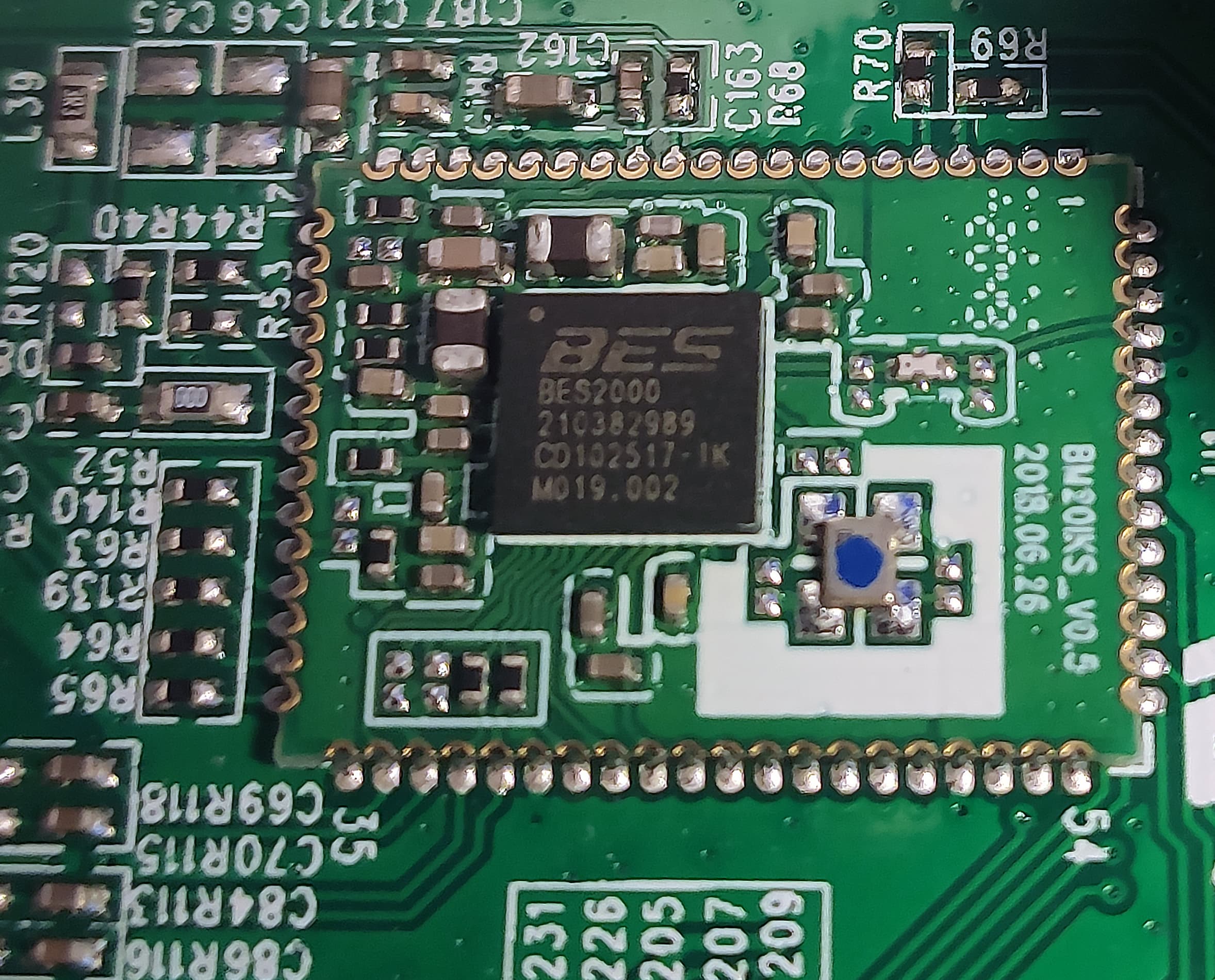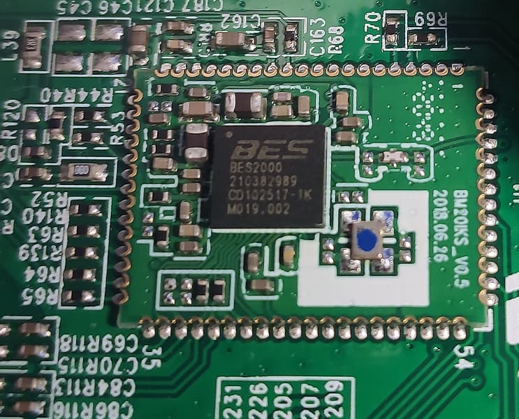 Модуль беспроводной связи скромно прикрыт наклеечкой, которую нам ничего не мешает удалить и выяснить, что построен он на далеко не самом «продвинутом» BES2000 (Cypress Semiconductor). Как мы еще увидим ниже, связь посредством Bluetooth добавлена в акустику как «очень дополнительная» функция.