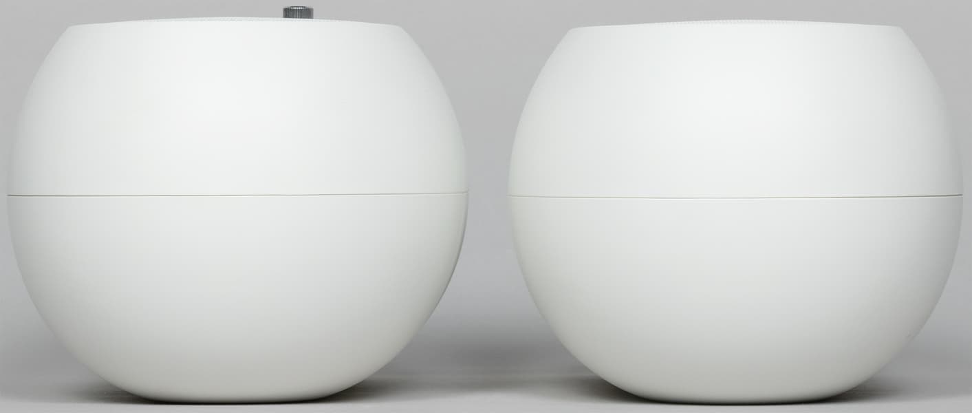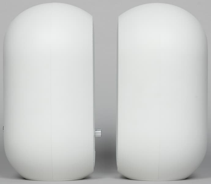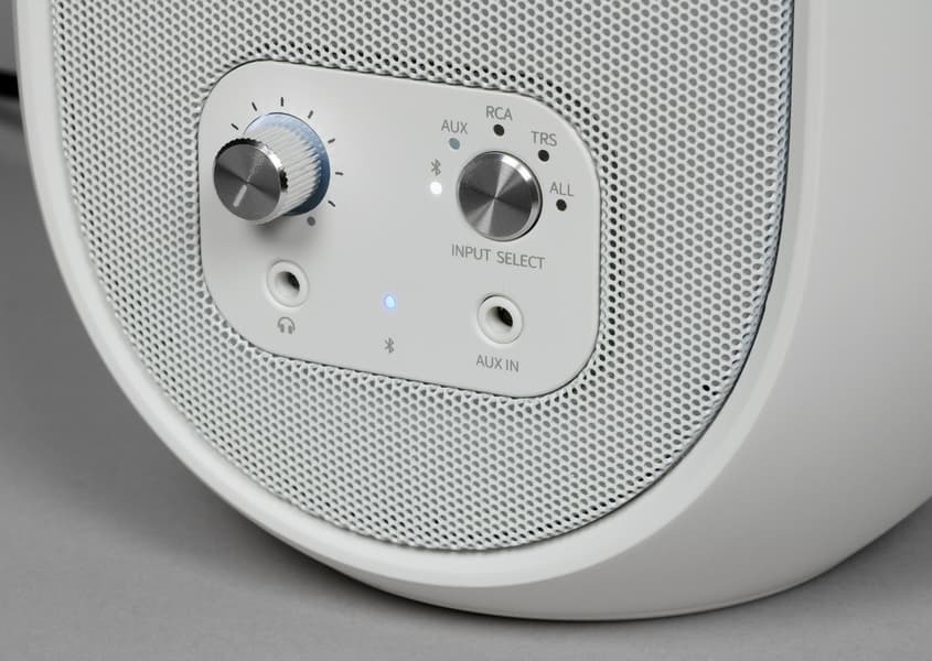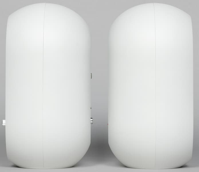 Спереди размещена металлическая сетка, за которой скрываются коаксиальные динамики. У активной колонки также имеется небольшая панель управления/подключения в нижней части.