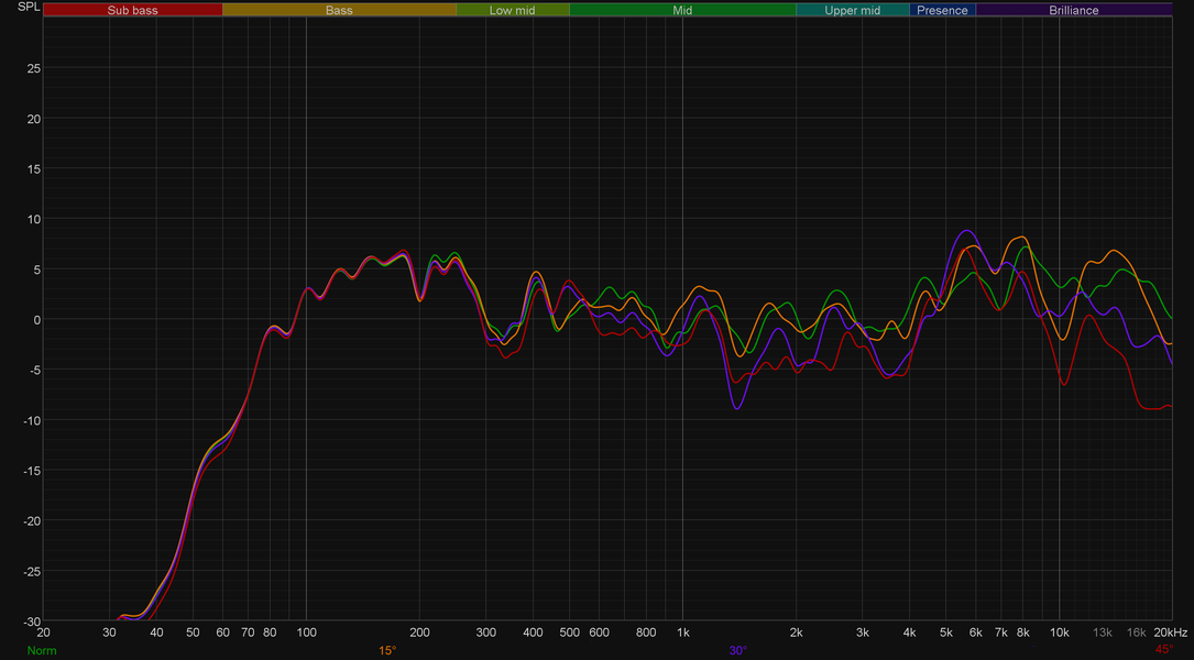 И вот тут надо отметить, что отверстия фазоинверторов выведены назад, а измерения мы традиционно проводим, расположив микрофон на оси динамика. На деле низкочастотный диапазон подается полнее, особенно если за фазоинвертором есть поверхность, способная отражать звук. Следующий важный момент — JBL 104-BT очень чувствительны к размещению. Попробуем немного покрутить колонки и снять графики при расположении их под разным углом к микрофону. Становится очевидно, что направлять тестируемые мониторы следует прямо на слушателя — как и любые другие компактные колонки.