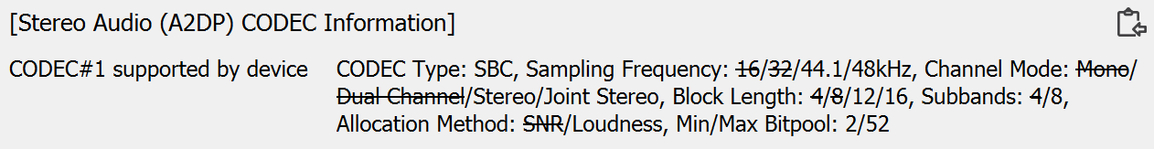 Полный список поддерживаемых кодеков и их режимов мы традиционно получили с помощью утилиты Bluetooth Tweaker. Ну то есть список — это громко сказано, кодек-то всего один. Акустика поддерживает только базовый SBC, даже AAC нет. Как уже упоминалось выше, поддержка беспроводного подключения явно рассматривалась разработчиками как дополнительная функция, но не более того.