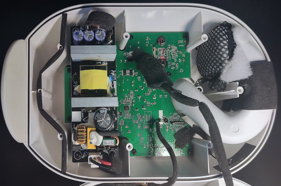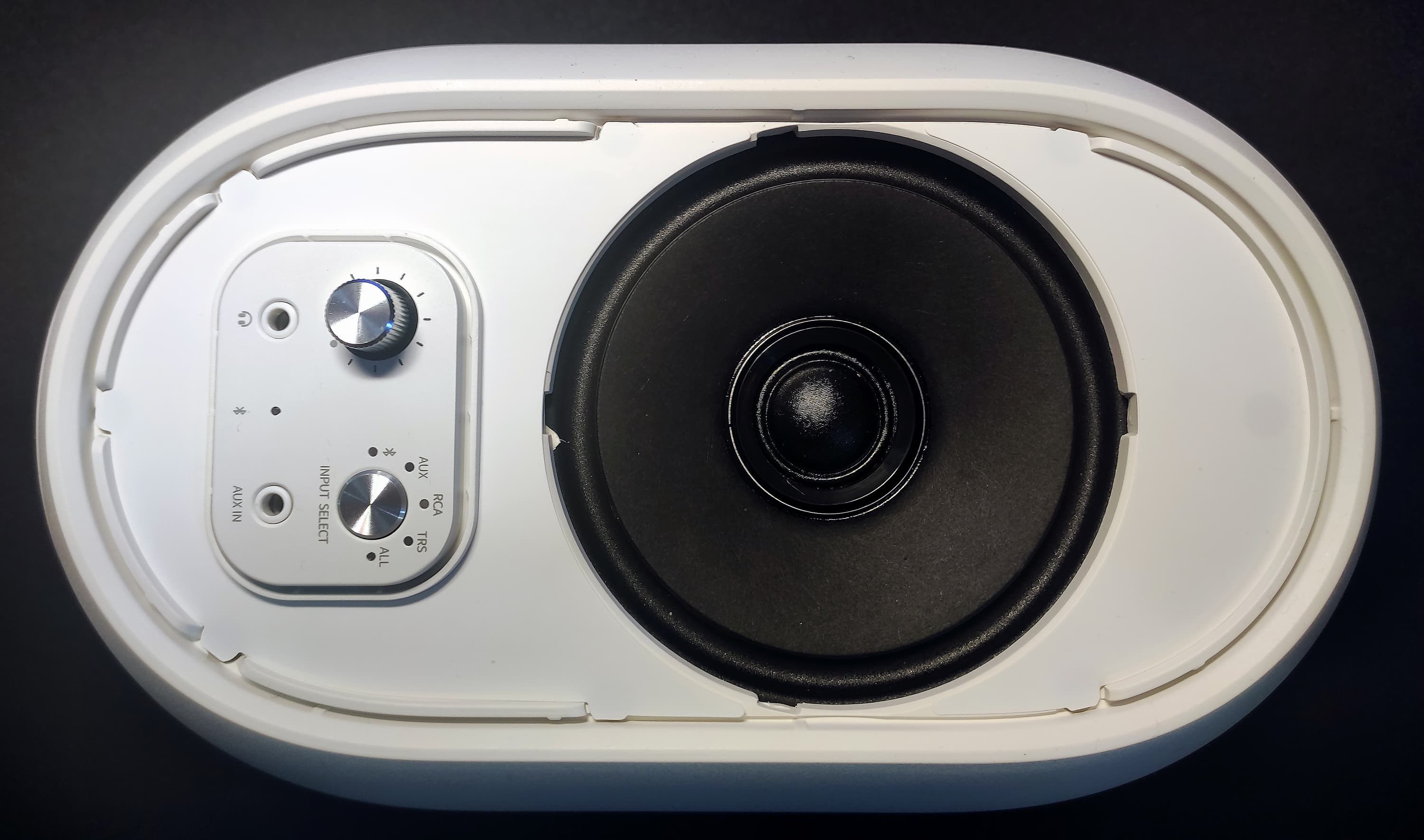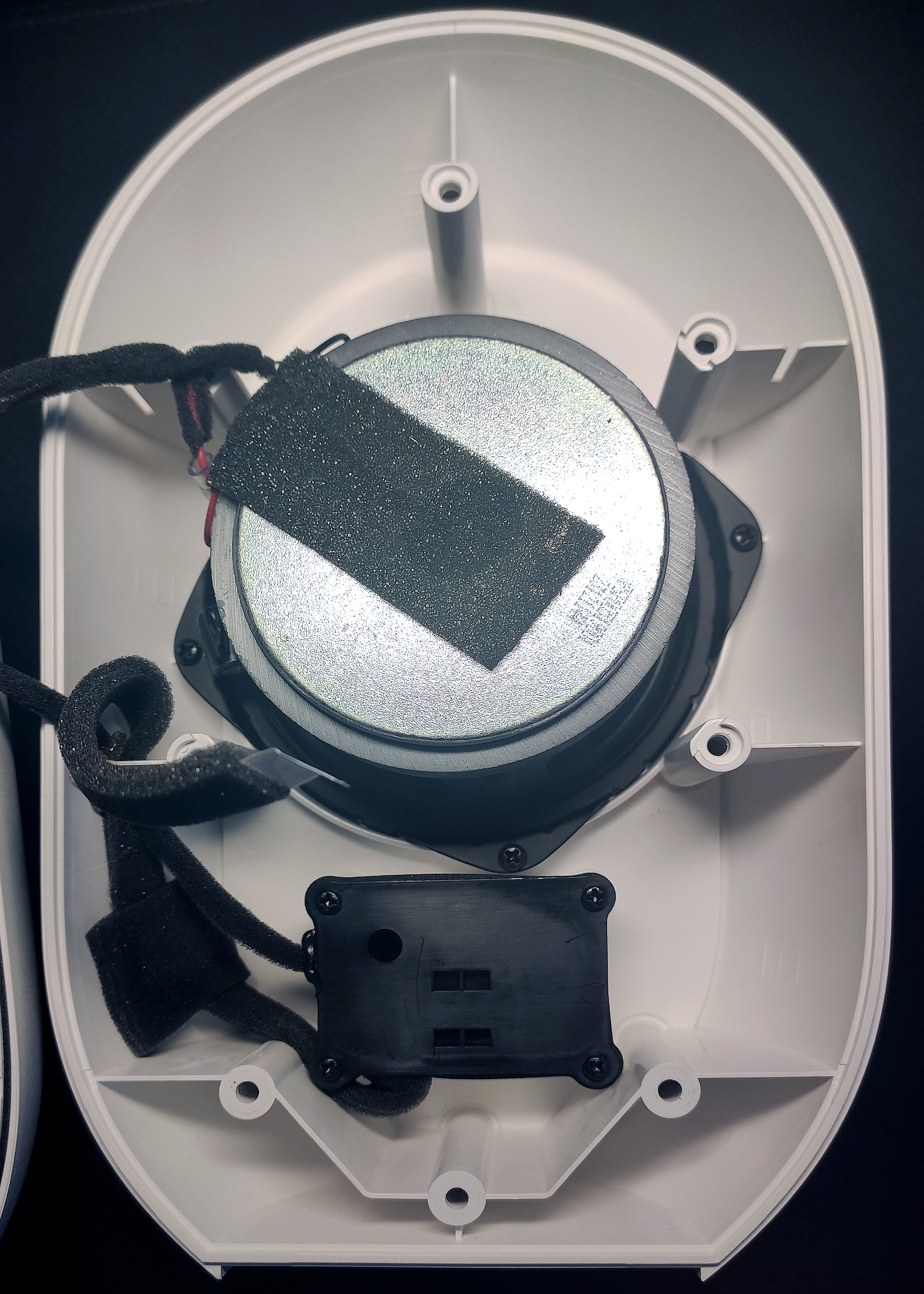 Разделяем половинки корпуса. В одной мы видим расположенных друг над другом две платы, на другой — динамик. Внутреннее отверстие трубы фазоинвертора закрыто мягким материалом, удерживаемым с помощью сетки — довольно оригинальное решение.