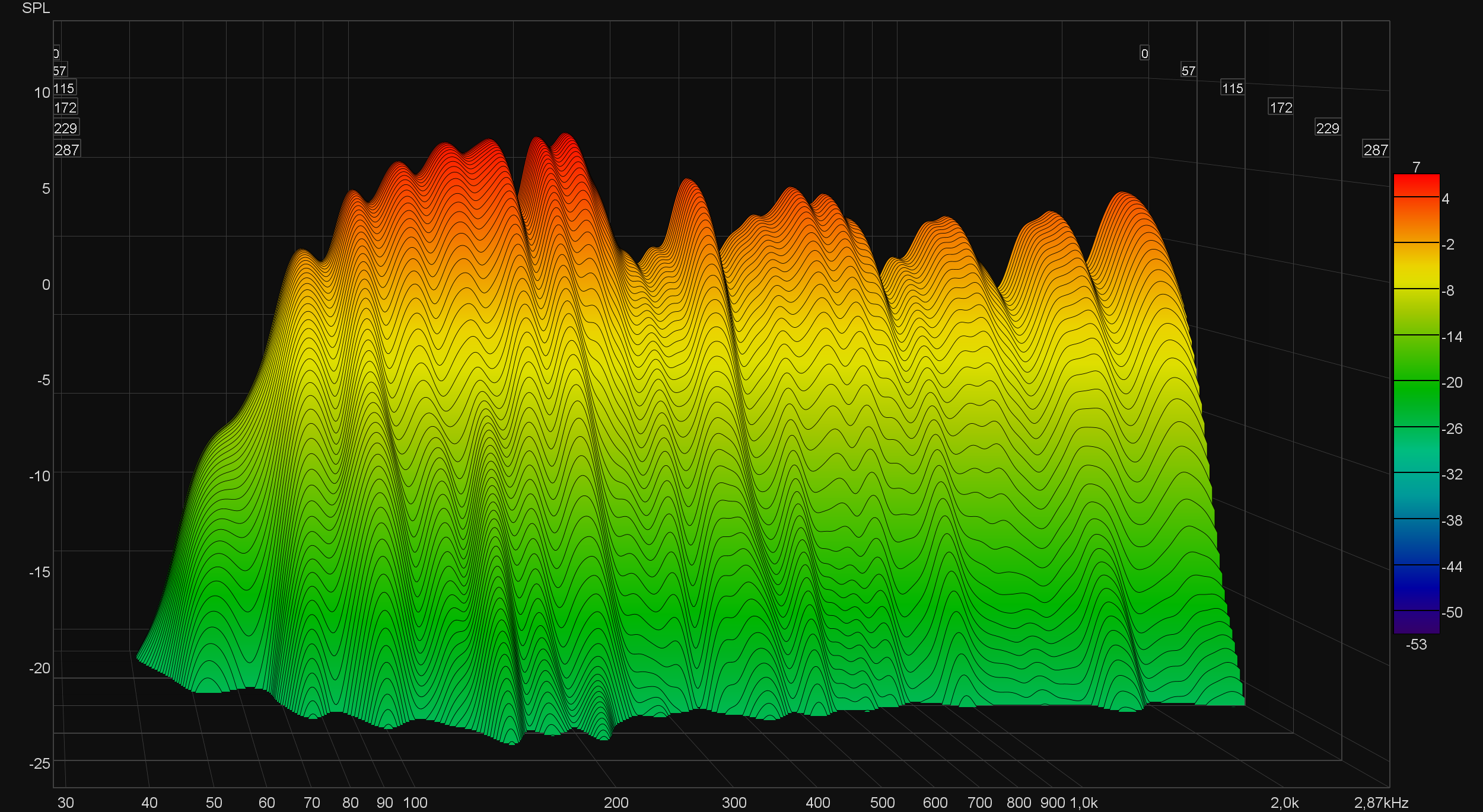 Порадовало, что корпус колонок не склонен к лишним резонансам и «гудению», что прекрасно видно по графику кумулятивного затухания спектра (он же «водопад» или waterfall). Баса, конечно, немного — взяться ему неоткуда. Но тот, что есть, подается с отличной атакой и без намека на «бубнение».