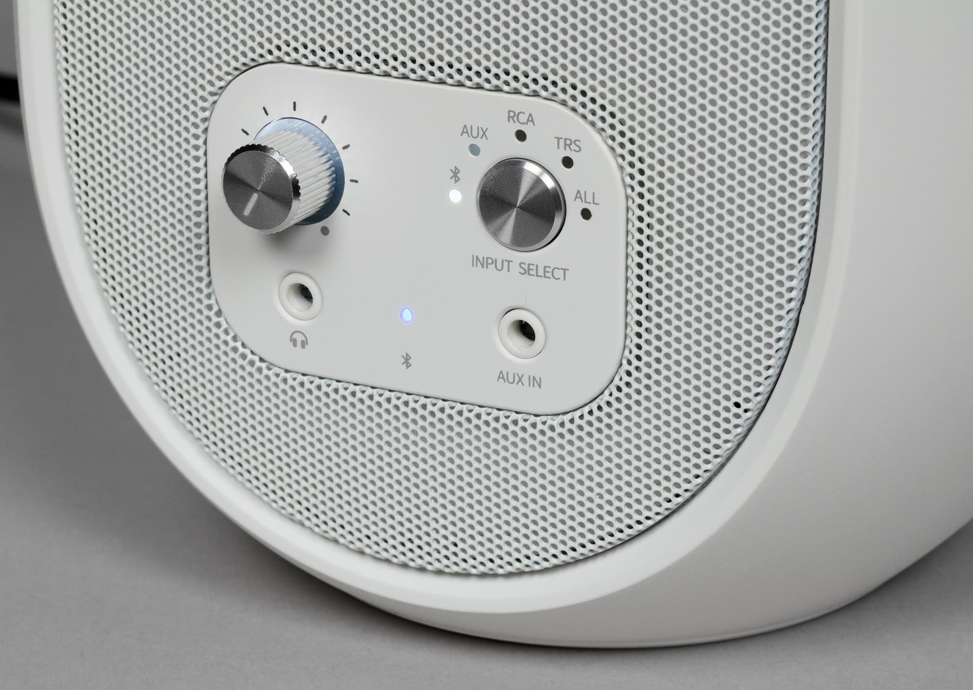 На передней панели мы видим еще два разъема для подключения — миниджеки 3,5 мм. Левый служит для наушников, при подключении которых звук в колонках отключается. Ну а правый — это еще один вход. Между разъемами находится уже упомянутый выше индикатор Bluetooth-подключения.