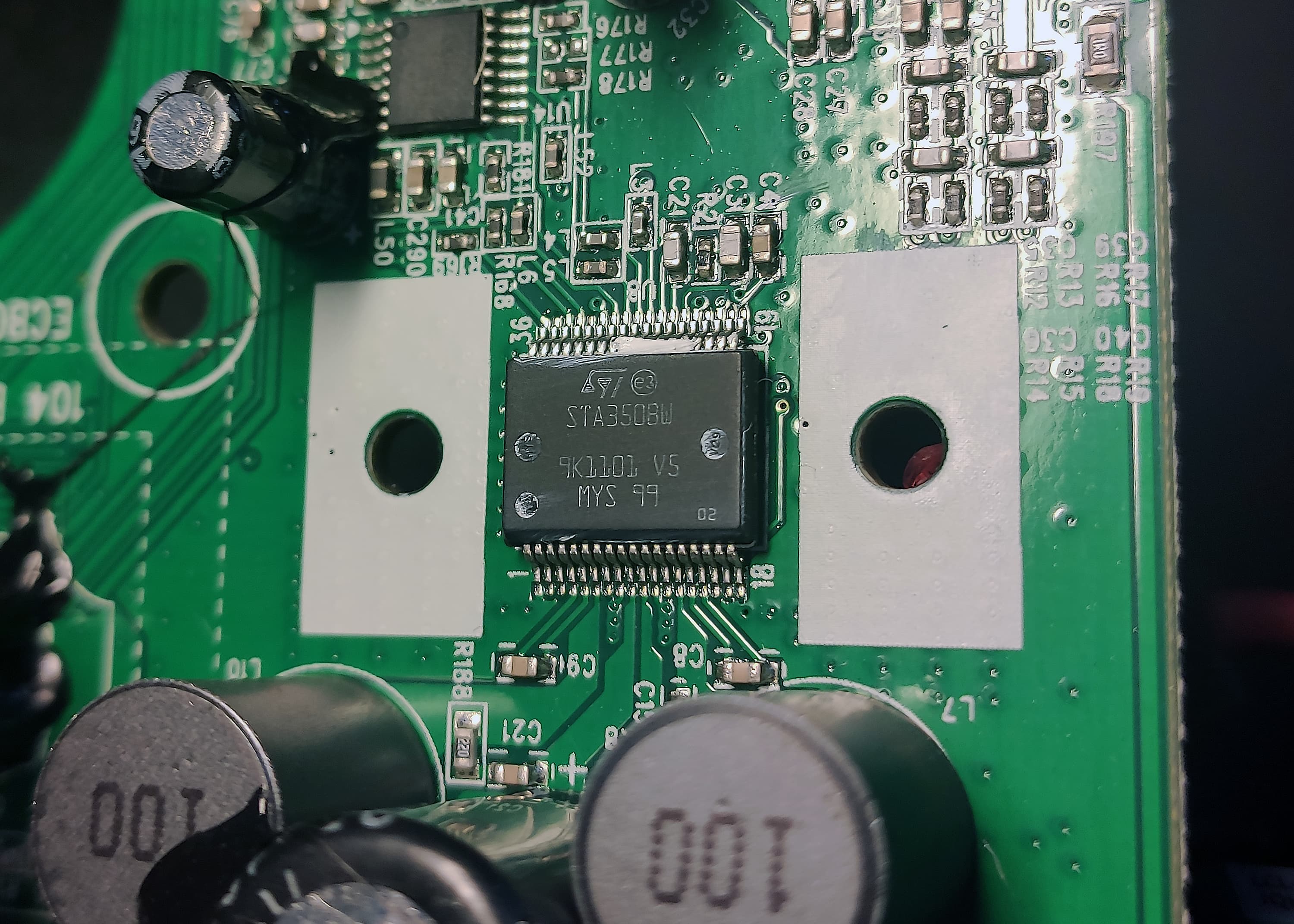 Усилитель работает в классе D и построен на основе микросхемы STA350BW (STMicroelectronics). Она скрыта за собственным радиатором и хорошо покрыта термопастой — качество сборки у акустики, кстати, предсказуемо высокое.