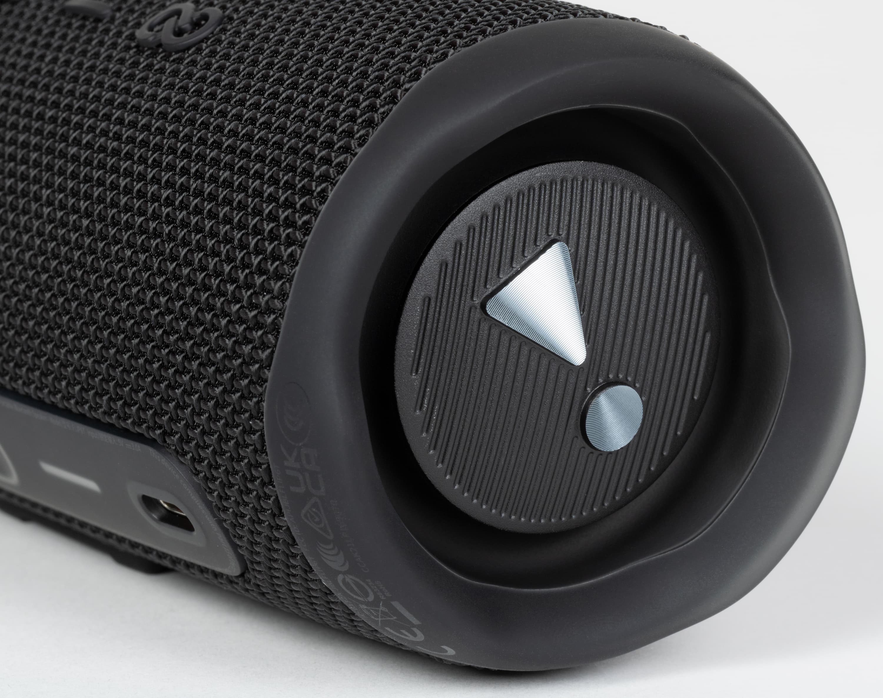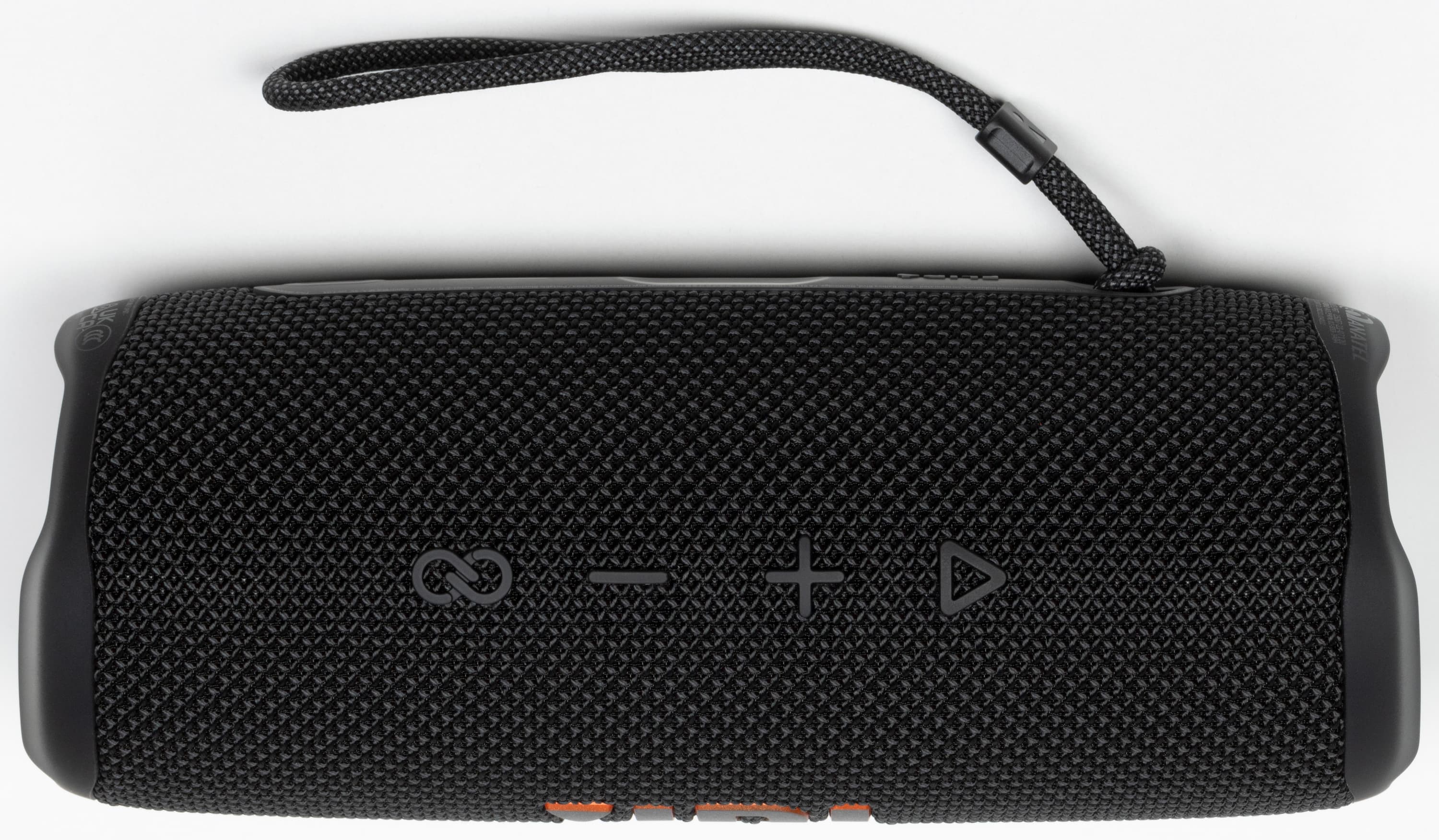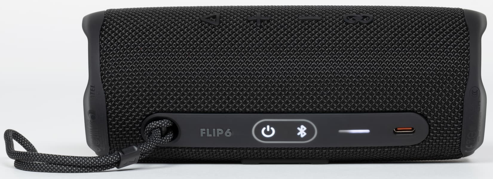 JBL Flip 6 предлагается в 9 цветовых решениях: черном, синем, зеленом, сером, розовом, красном, бирюзовом, белом и камуфляжном — есть из чего выбрать. Мы выбрали строгий и немаркий черный вариант. Форма корпуса по-прежнему бочкообразная, дизайн узнаваем и в целом характерен для линейки.