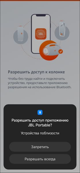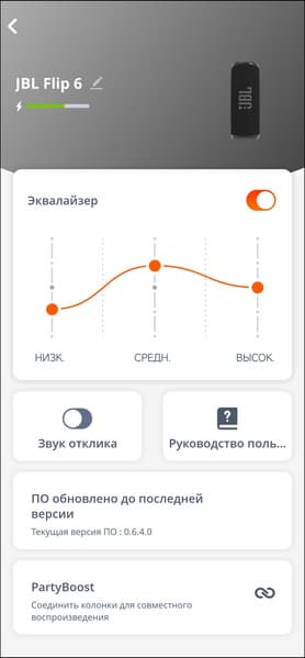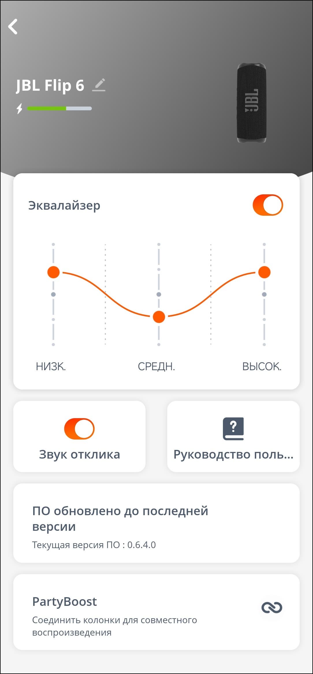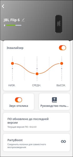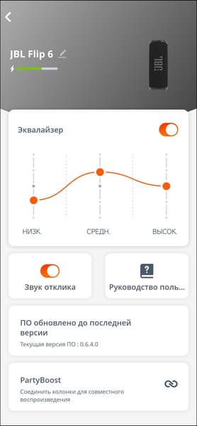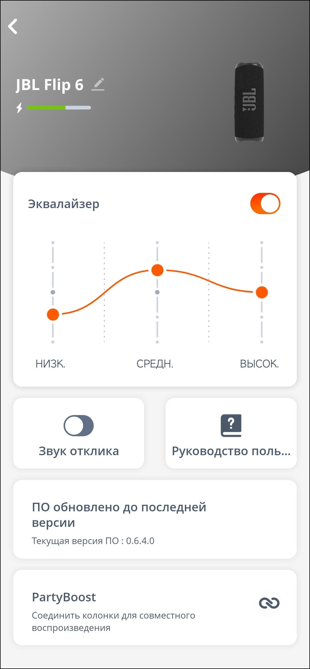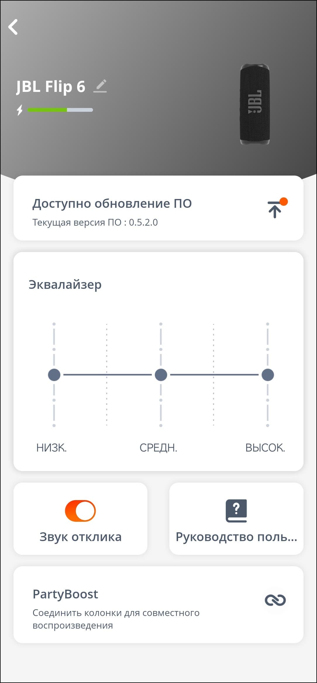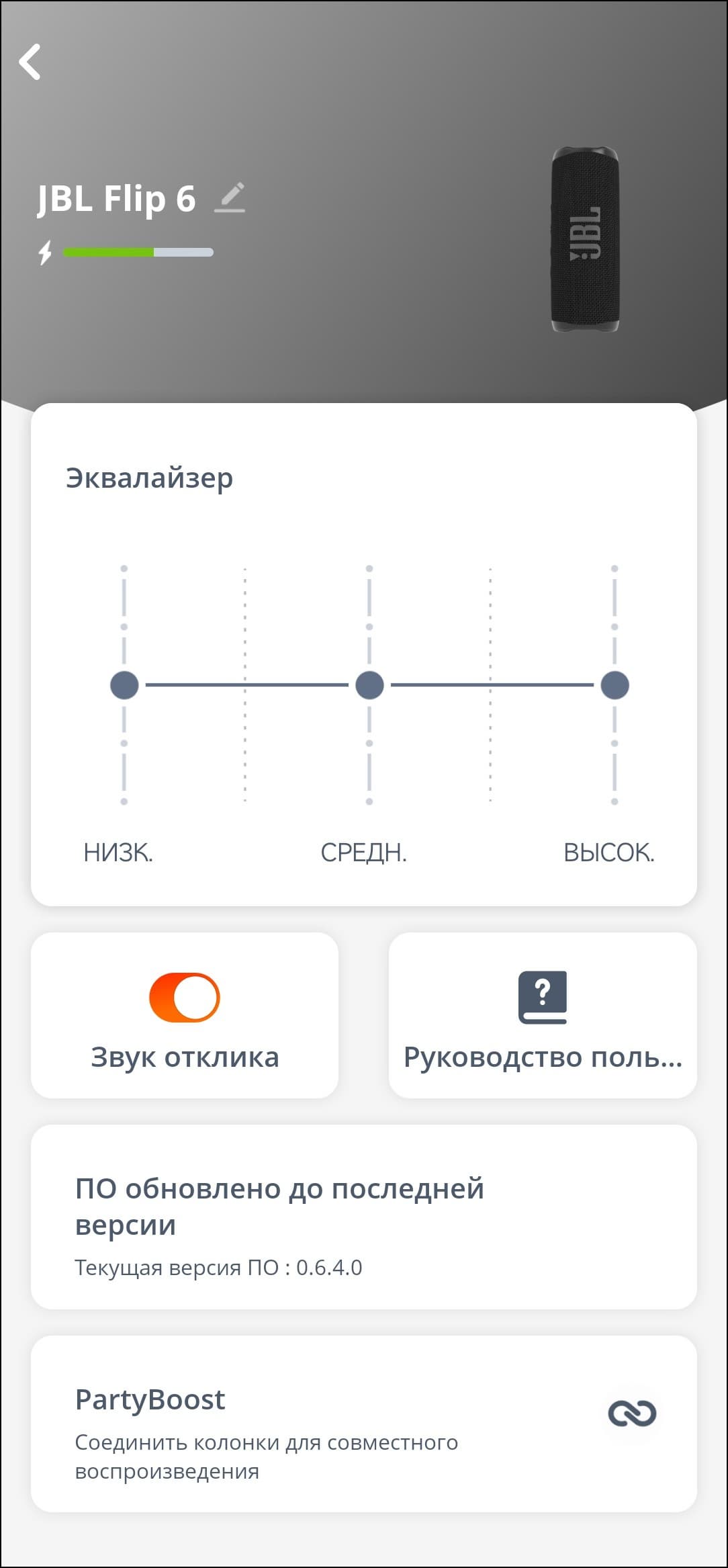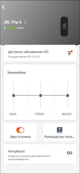 После установки JBL Portable сразу обнаруживает подключенную ранее JBL Flip 6, проверяет наличие обновлений прошивки и, если они имеются, предлагает их установить. Занимает это пару-тройку минут.