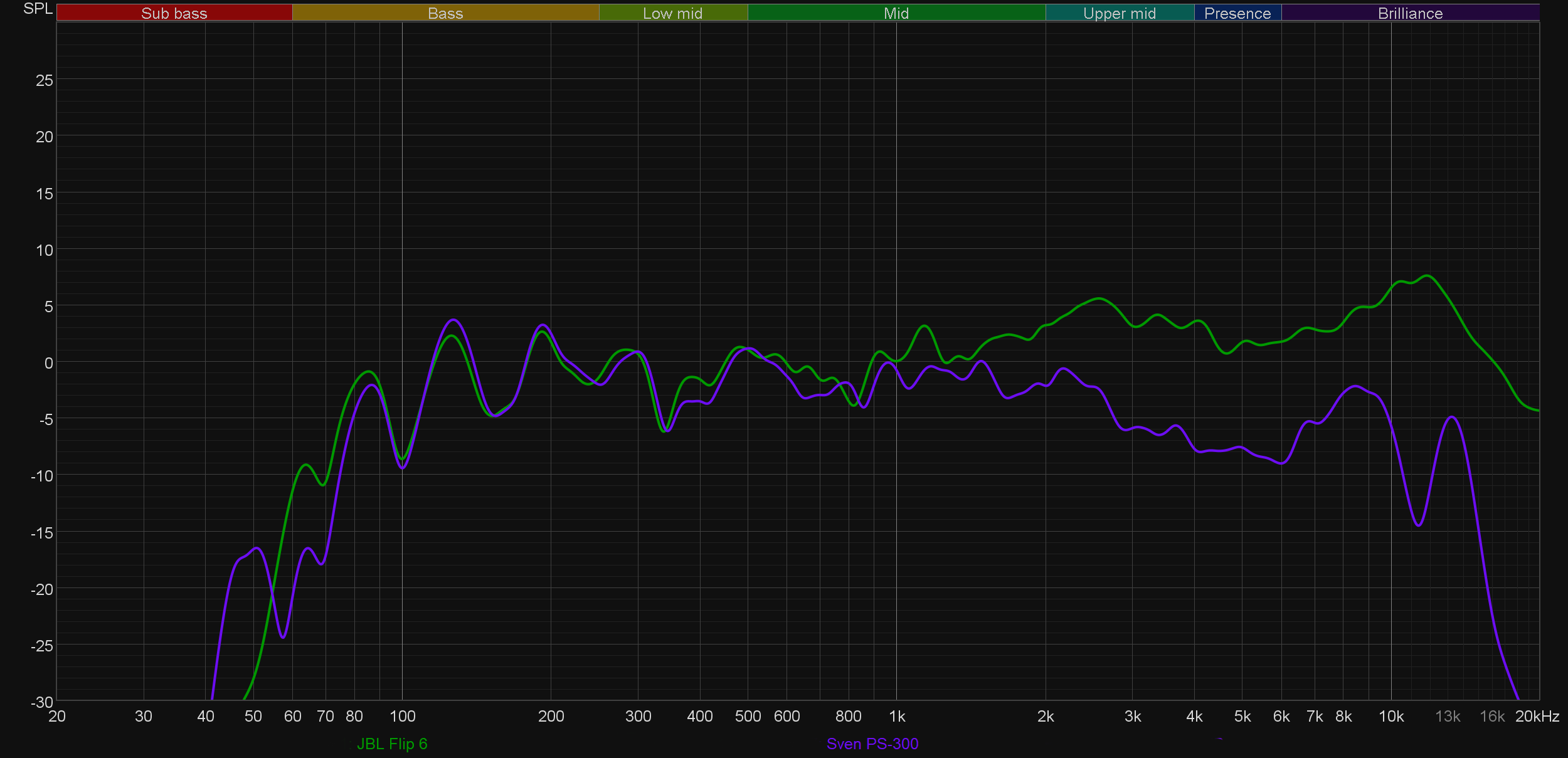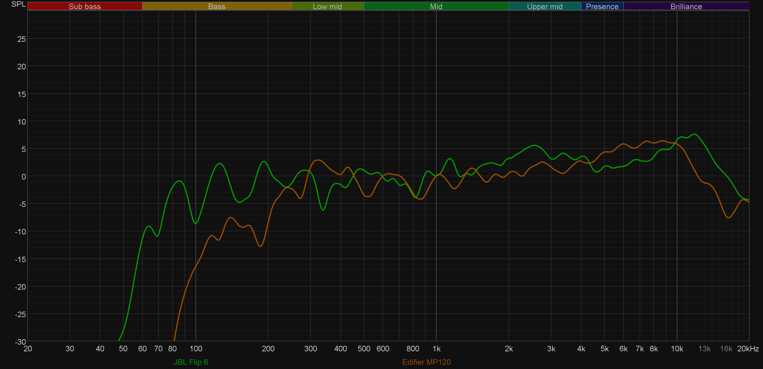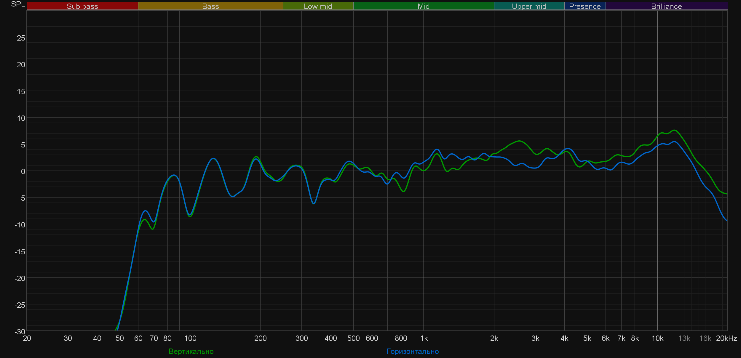 График выше получен при вертикальном расположении JBL Flip 6, посмотрим, насколько сильно изменится АЧХ при горизонтальном. Разница есть, но не самая большая — в качестве основы для дальнейших экспериментов и сравнений возьмем график в вертикальном расположении.