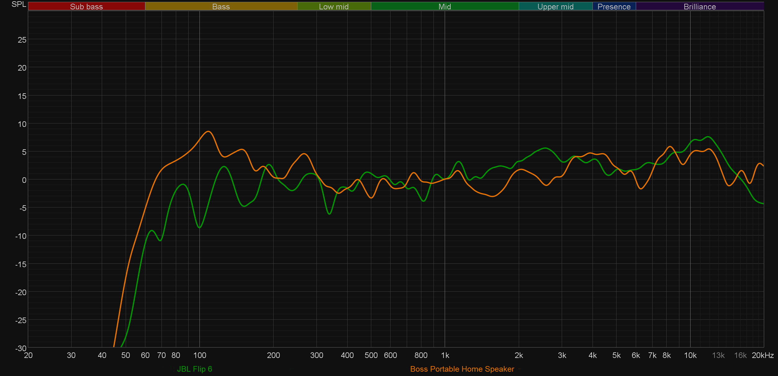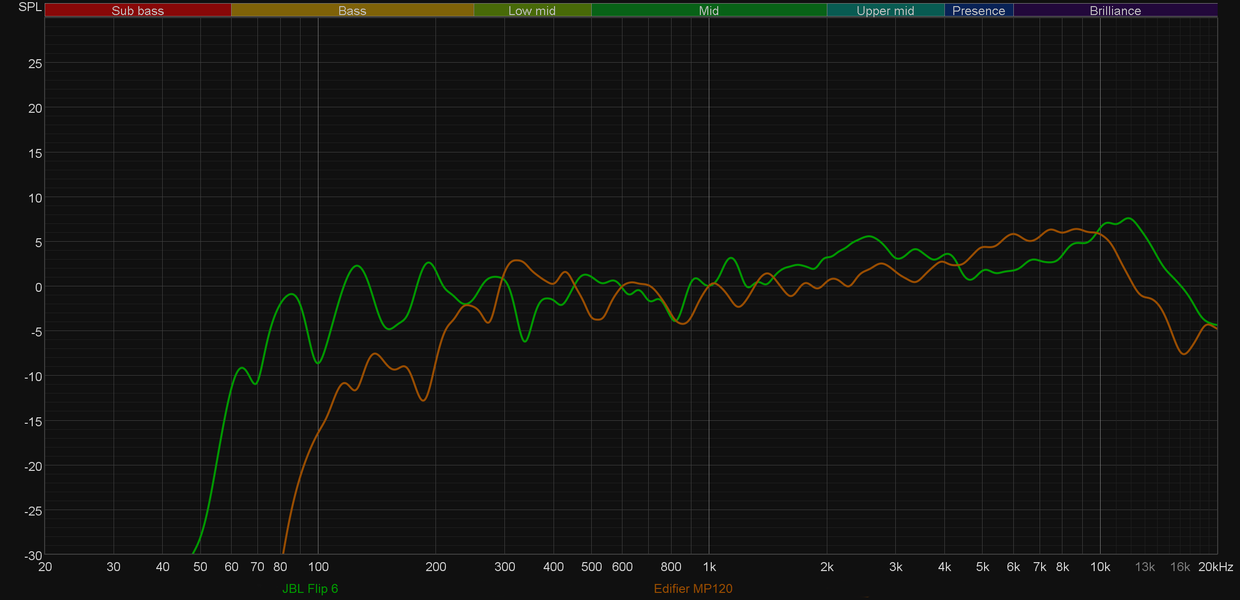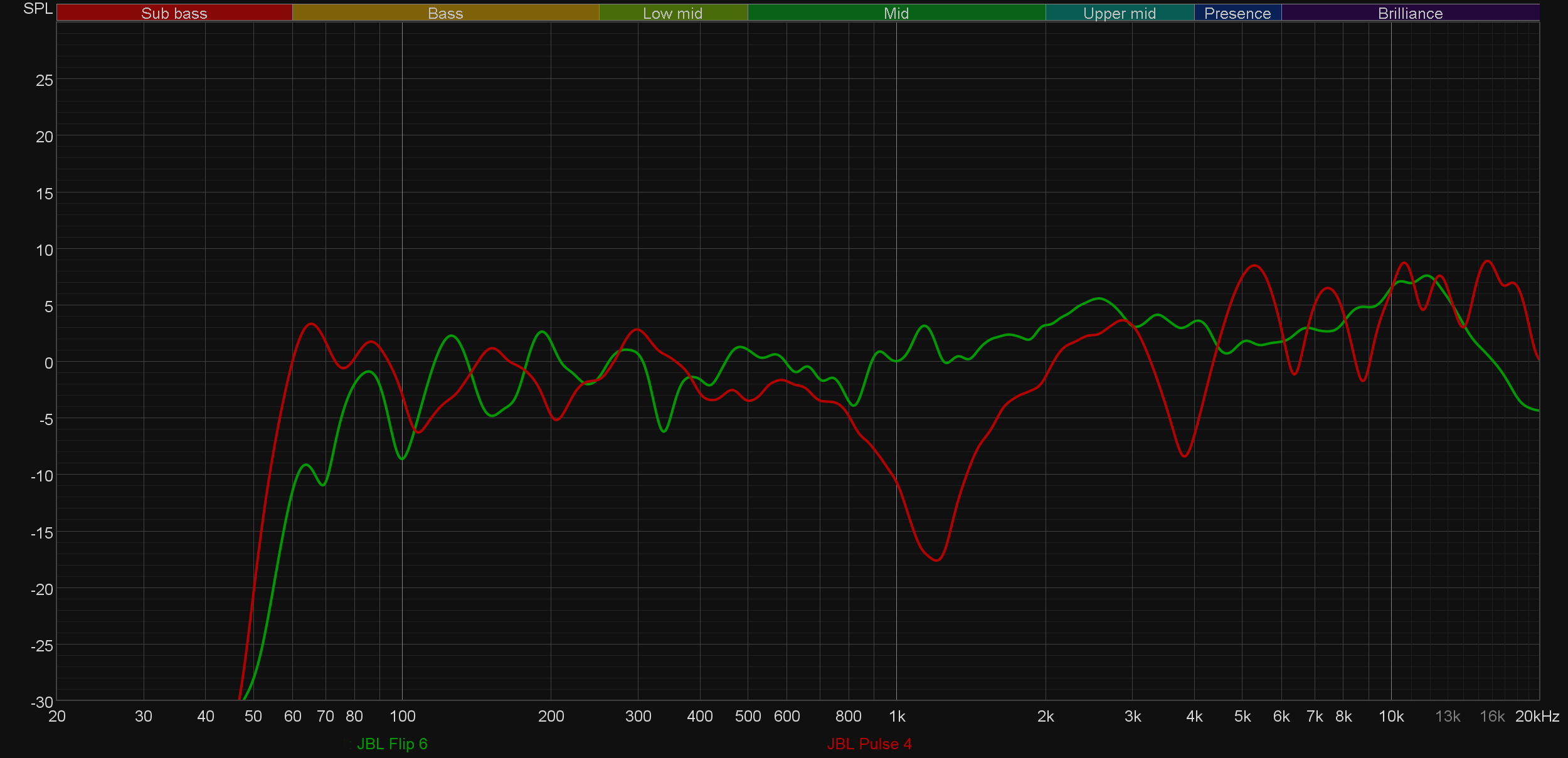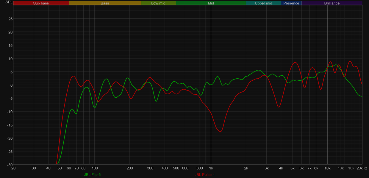 График выше получен при вертикальном расположении JBL Flip 6, посмотрим, насколько сильно изменится АЧХ при горизонтальном. Разница есть, но не самая большая — в качестве основы для дальнейших экспериментов и сравнений возьмем график в вертикальном расположении.