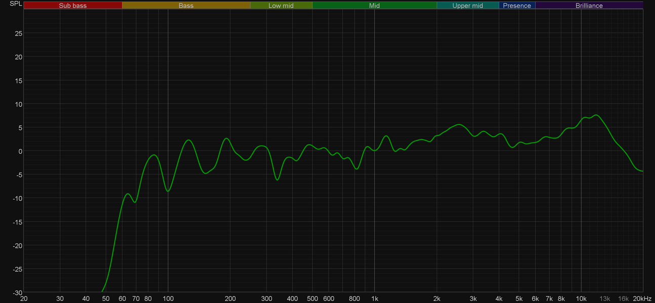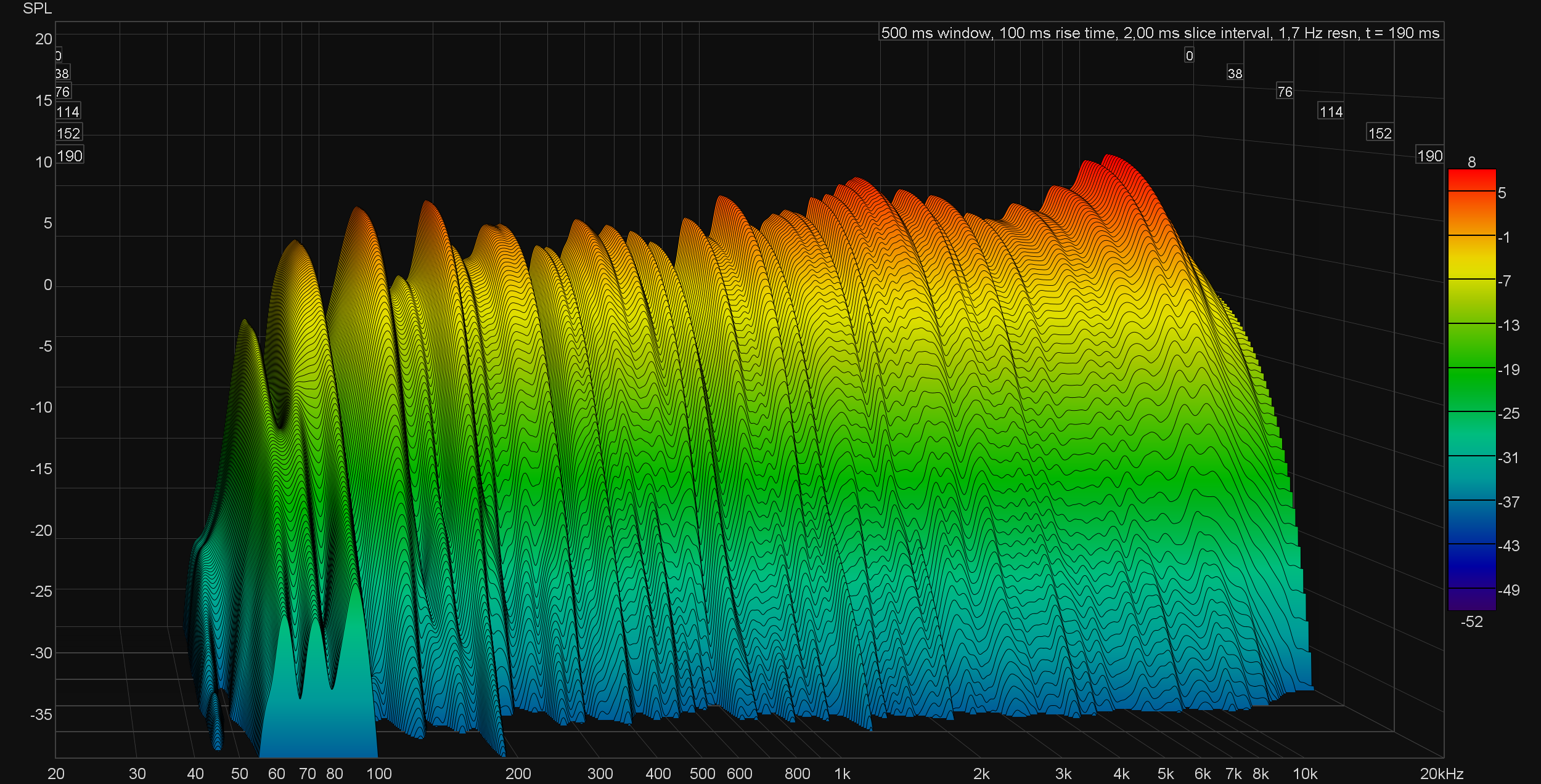 «Глубокого» баса здесь ожидать не приходится, звучание от 60 Гц в данном случае — уже достижение. Пассивные излучатели расширяют возможности колонки в НЧ-диапазоне, но делают его немного гулким, что хорошо видно по графику кумулятивного затухания спектра (он же «водопад» или waterfall).