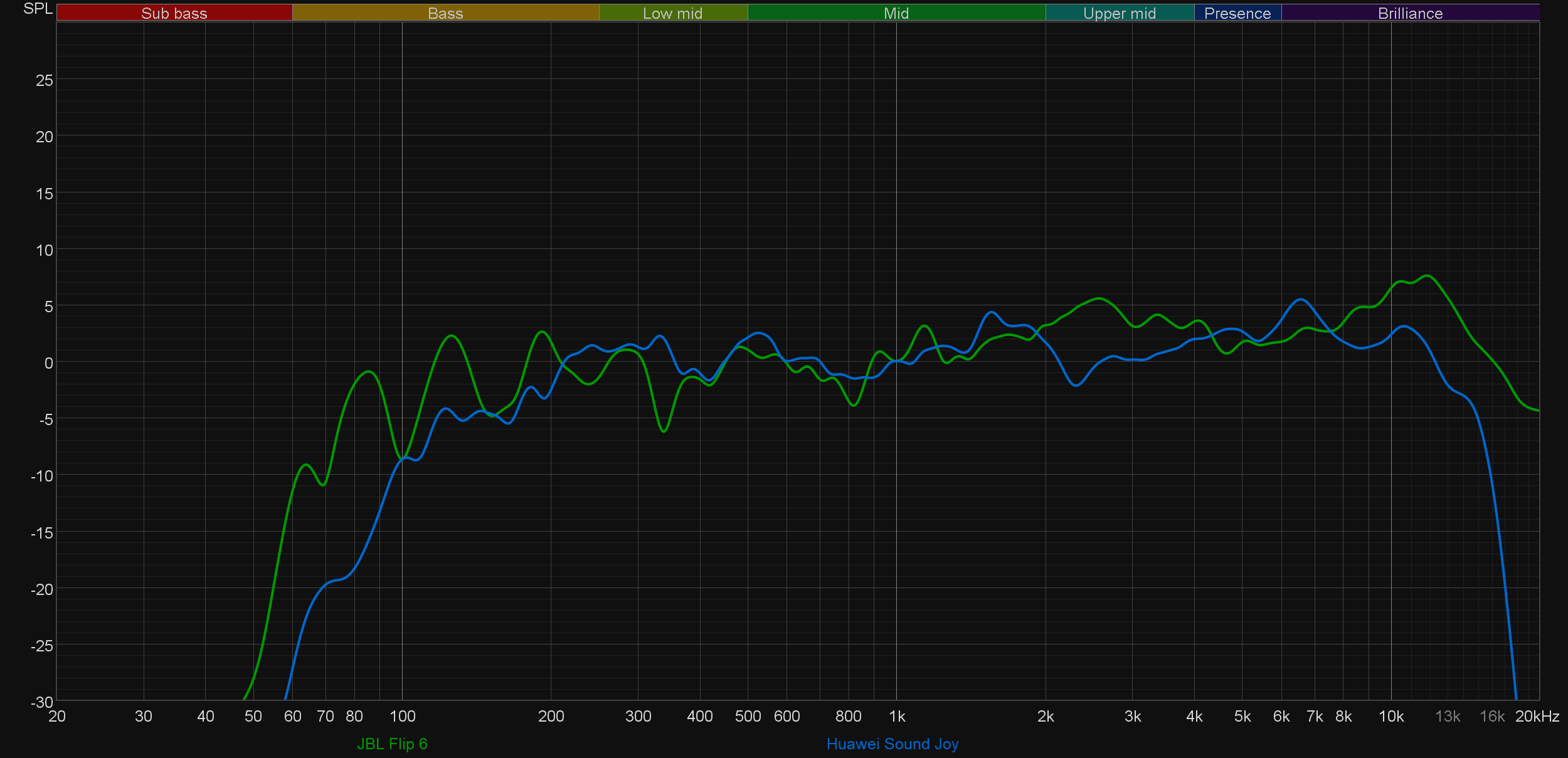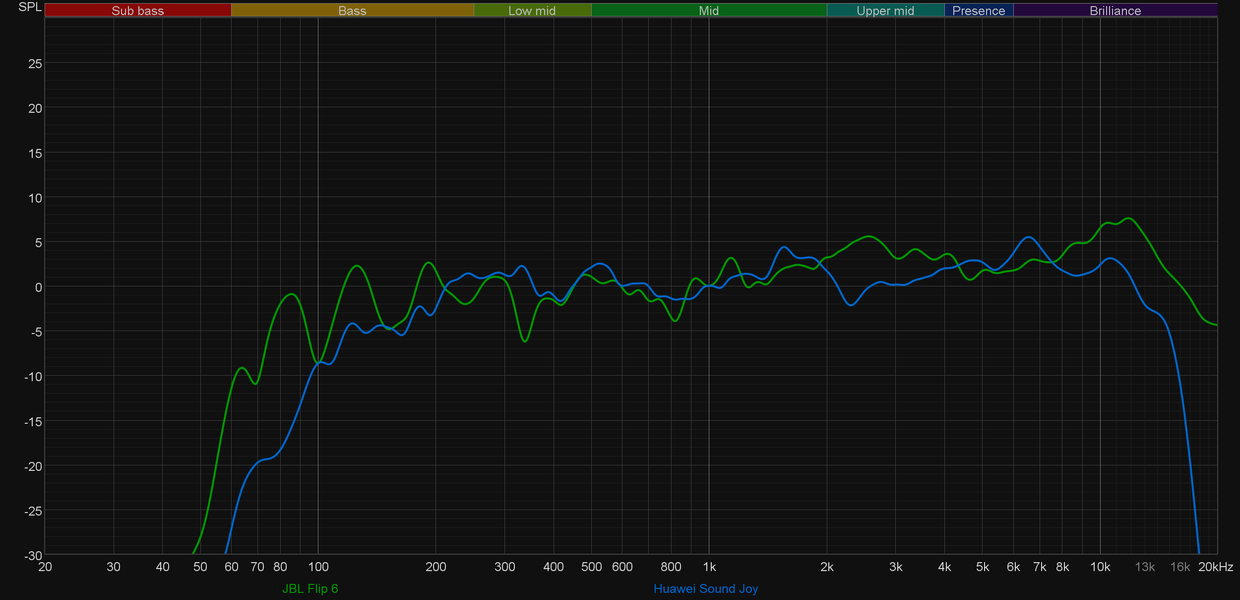 Нельзя сказать, что Huawei Sound Joy звучит хуже — ее «ровная» середина и плотный бас нас очень порадовали, но всё же JBL Flip 6 увереннее чувствует себя и в НЧ-диапазоне, и в верхних частотах. Так что тут дело вкуса: если хочется более сдержанного и плотного баса — стоит выбрать Huawei Sound Joy, более «качающего» — JBL Flip 6.
