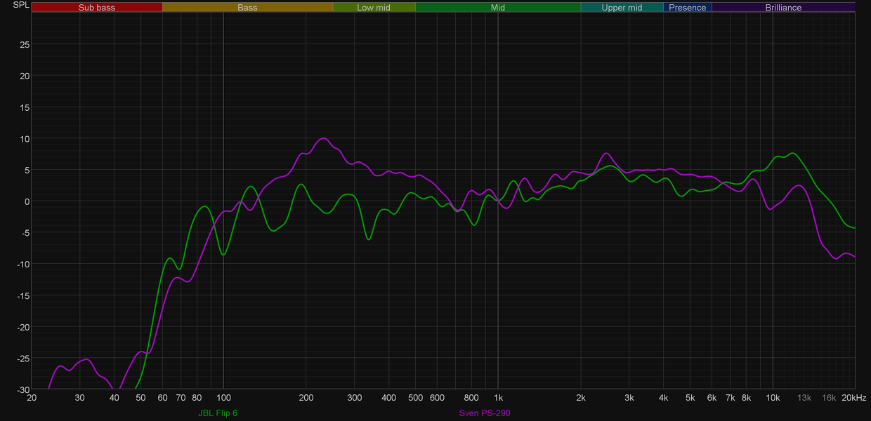 Посмотрим, что нам даст рост габаритов. Sven PS-290 уже и побольше, и весит почти килограмм. Тут у нас уже и середина на месте, и ВЧ-регистр присутствует. Акцент на басе и нижней середине — такой, на любителя. Но в целом звучание можно считать очень приемлемым. При этом стоимость по-прежнему в два раза меньше, чем у Flip 6. Но всё же JBL звучит приятнее, баса выдает даже больше, но при этом намного меньше и легче.