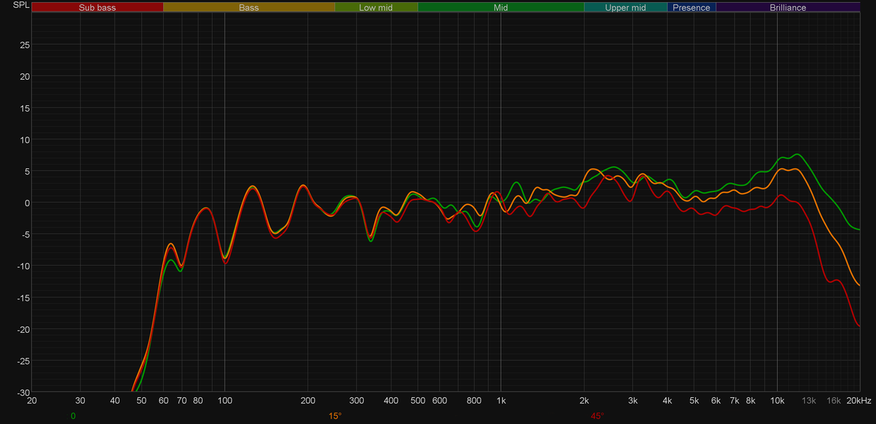 Динамики направлены в одну сторону, потому уместно будет посмотреть на горизонтальную дисперсию звука. С ней всё очень неплохо — даже под углом 45° звучание меняется не слишком критично, в основном потери касаются ВЧ-регистра.